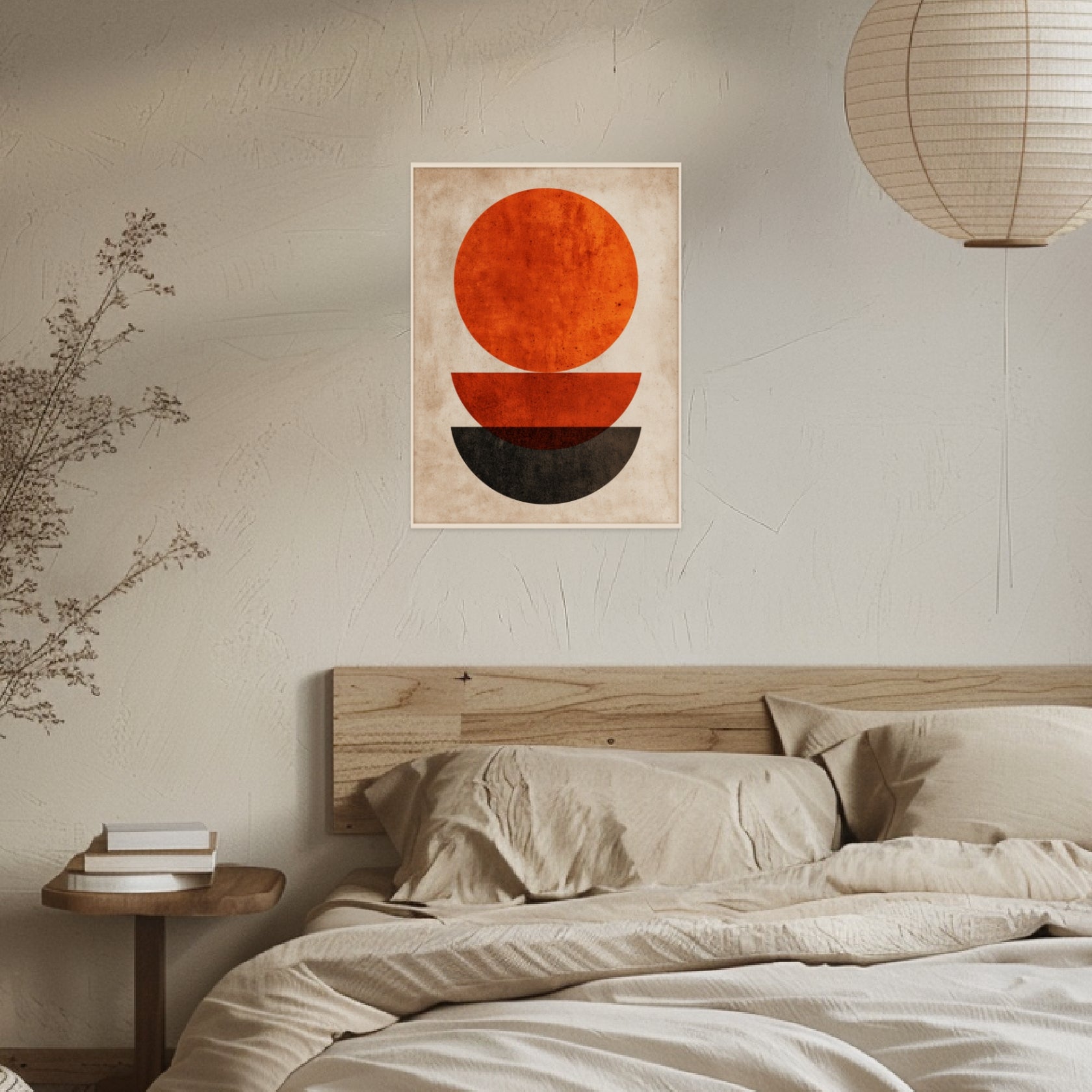 Die Formen stehen in einem ruhigen Gleichgewicht und entfalten durch die warme Farbgebung eine behutsame Tiefe. Die Leinwandstruktur verleiht dem Motiv eine leichte haptische Präsenz, die sich besonders im Schlafzimmer angenehm entfaltet. Die klare Geometrie trägt die Essenz des Japandi Stil und wirkt zugleich modern und geerdet. In einem fein abgestimmten Japandi Interior fügt sich das Bild nahtlos ein und wird Teil einer stillen, harmonischen Umgebung. Als eines der ruhigen Japandi Bilder begleitet es den Raum mit subtiler Klarheit, während es als Japandi Wandbilder durch seine Tiefe einen sanften Akzent setzt.