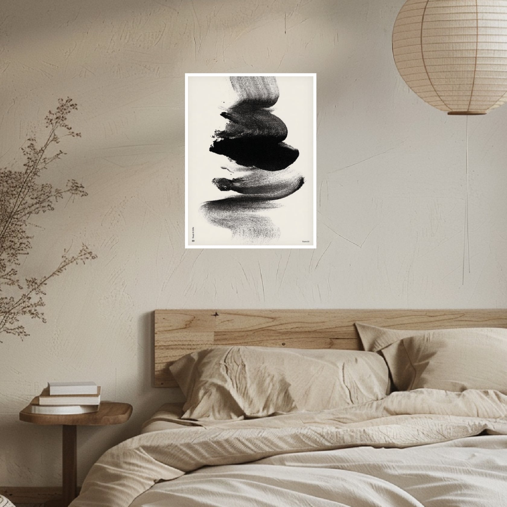 Mehrere übereinanderliegende Pinselbewegungen formen eine ruhige, vertikale Komposition, die von bewusster Unregelmäßigkeit lebt. Der Kontrast zwischen sattem Schwarz und hellem Hintergrund schafft Tiefe und lässt Raum für Interpretation. Im Wohnzimmer oder im Flur entfaltet das Poster eine ordnende Wirkung, die den Blick sammelt und zur Ruhe führt. Das Motiv folgt der Philosophie des Japandi Designs, in dem Reduktion und Ausdruck im Gleichgewicht stehen. Jeder Strich wirkt gesetzt, nichts ist zufällig, alles bleibt offen und ruhig zugleich.