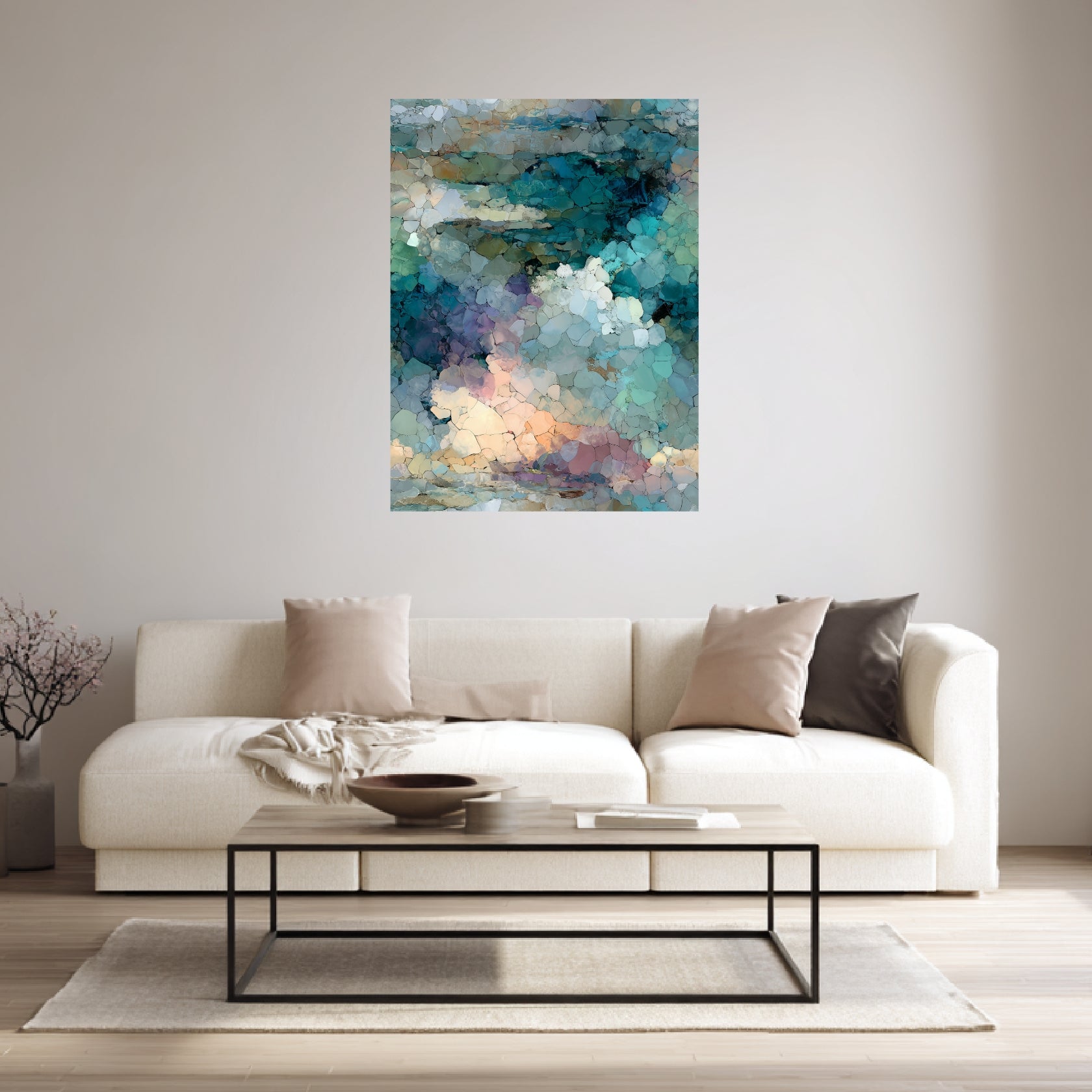 In diesem Werk legen sich zahlreiche transluzente Farbfragmente übereinander und formen eine weitläufige, vielschichtige Komposition. Die Mischung aus kühlen Blau- und Türkistönen verschmilzt mit warmen Rosé- und Beigenuancen, wodurch ein sanfter Kontrast entsteht, der die Bildfläche optisch öffnet. Die Struktur wirkt beinahe wie polierte Steinsegmente, die feine Risse und Schattierungen tragen und so eine subtile Tiefe erzeugen. In der fließenden Bewegung der Flächen entsteht ein ruhiger Spannungsbogen, der dem Bild seine elegante Klarheit verleiht. Zwischen helleren Segmenten bildet sich ein luftiger Kern, der dem Motiv eine leichte Leuchtkraft schenkt und im Wohnzimmer oder Flur eine moderne Atmosphäre schafft. Diese Art der Form- und Farbgestaltung entspricht der stillen Ausdruckskraft hochwertiger Abstrakte Wandbilder und bettet zugleich die ästhetische Ruhe von Wandbilder Abstrakt Modern ein.