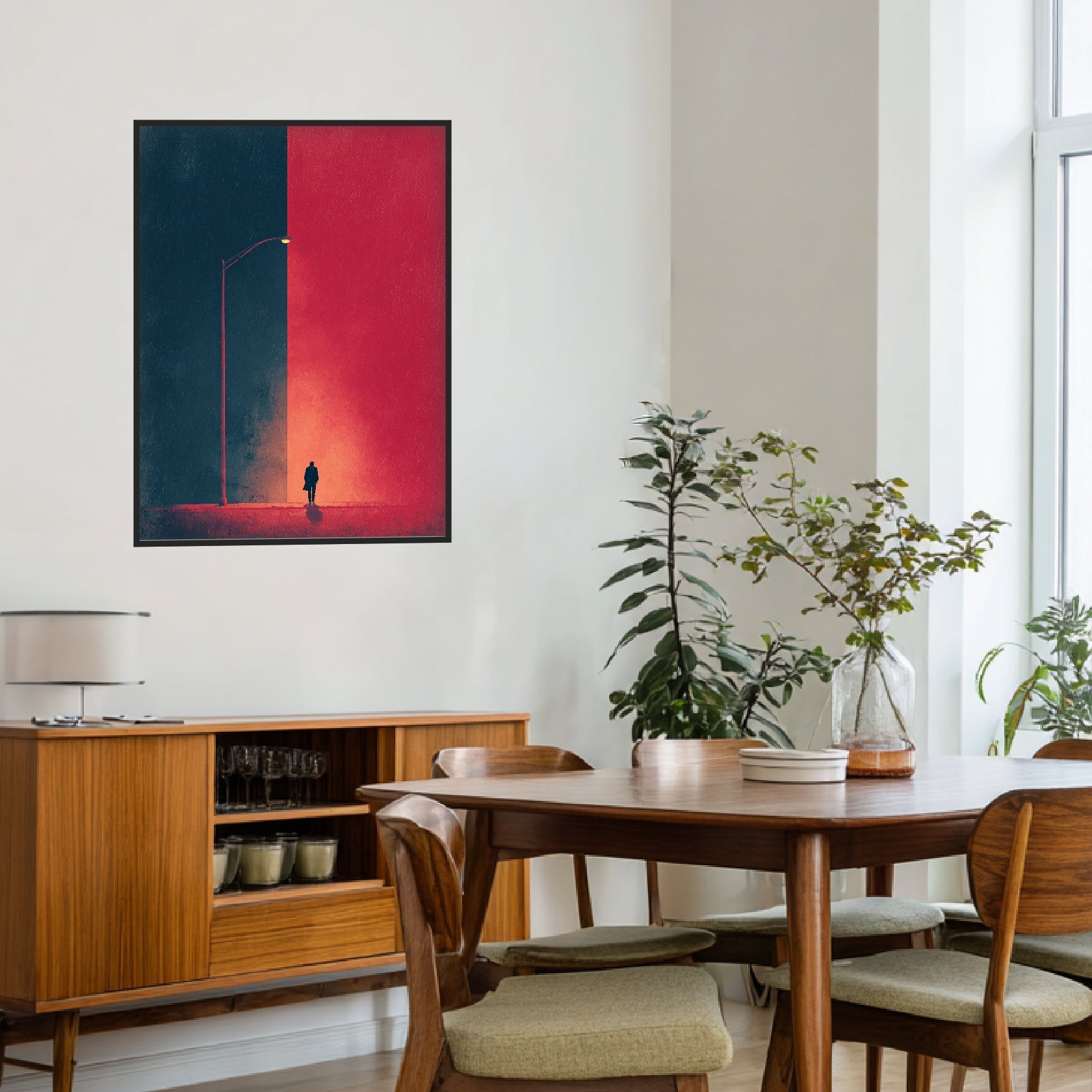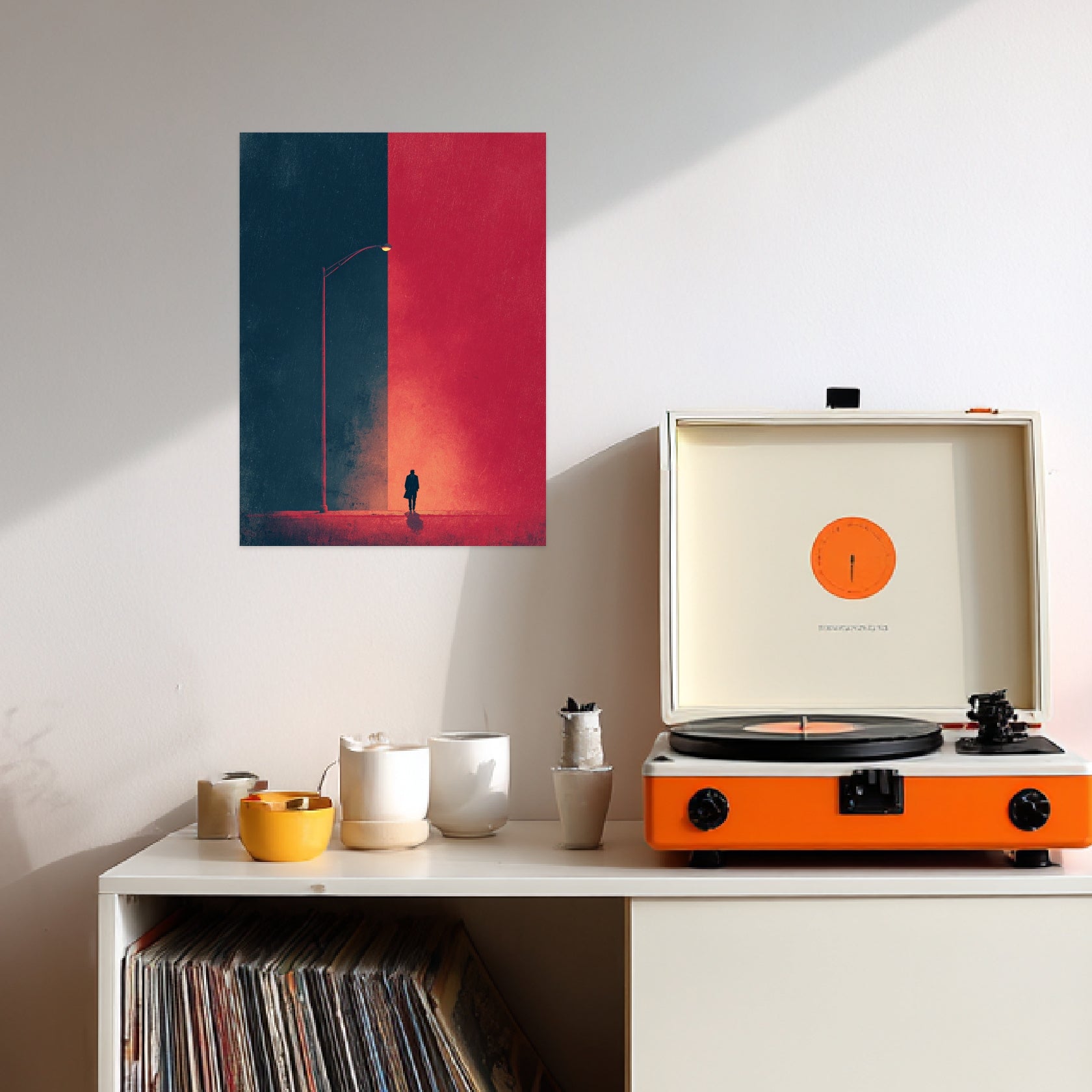 Das Motiv zeigt eine einzelne Person, die im Schimmer einer StraĂenlaterne steht. Die Szene ist von zwei klar getrennten FarbflĂ€chen bestimmt: Links ein tiefes, körniges Dunkelblau, rechts ein warmes, strukturiertes Rot. Die vertikale Teilung wirkt ruhig und grafisch ausgewogen, wĂ€hrend der Lichtkegel der Laterne eine weiche, analoge WĂ€rme erzeugt. Die Figur erscheint als feiner Schattenriss, der die stille Komposition ergĂ€nzt. Die Textur der FlĂ€che vermittelt einen zurĂŒckhaltenden Retro-Charakter und setzt einen ruhigen, atmosphĂ€rischen Akzent â ideal als Retro Poster oder Retro Stil.