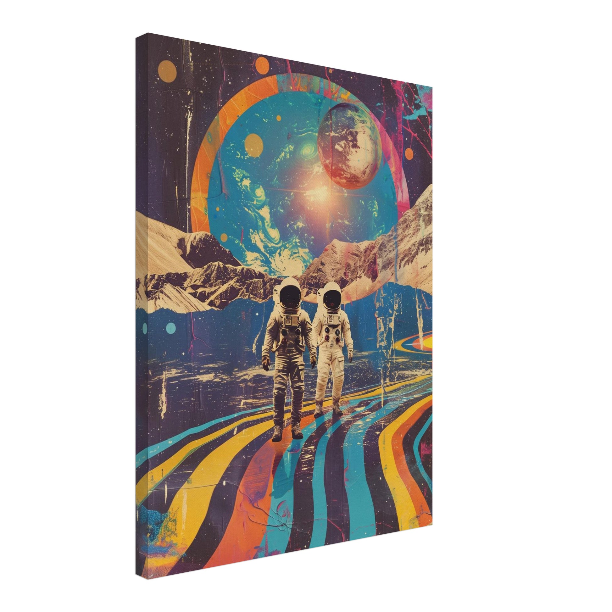 Ein weiches Strahlen legt sich über die Landschaft, als würden ferne Sonnen das Bild sanft erhellen. Die Astronauten treten vor einer mächtigen Komposition aus Planeten, Bergen und farbintensiven Linien hervor, die wie lebendige Impulse durch die Szene fließen. Diese visuelle Reise entfaltet die Essenz von Psychedelic auf ruhige, aber kraftvolle Weise und macht das Motiv zu einem eindrucksvollen Psychedelic Art Canvas. Als Teil moderner Psychedelic Bilder verleiht es insbesondere einem Schlafzimmer eine atmosphärische Tiefe, die zwischen Traum und kosmischer Realität schwebt. Das fein abgestimmte Psychedelic Design arbeitet mit strahlenden Kontrasten und sanft tanzenden Details, sodass die gesamte Komposition wie ein leuchtender Übergang in eine andere Welt wirkt.
