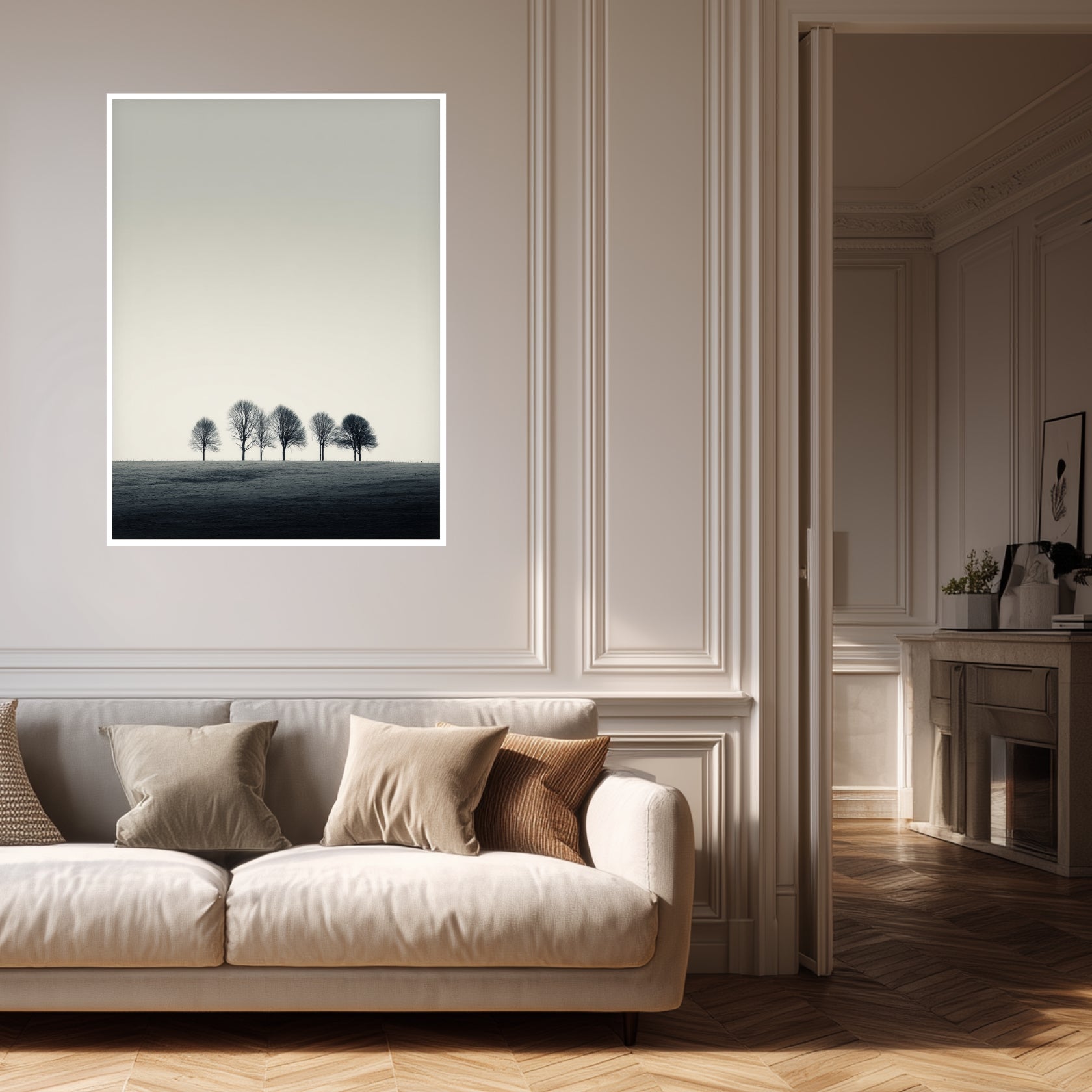 Die Landschaft ist auf wenige Elemente reduziert: eine sanfte Kuppe, darĂŒber eine Reihe kahler BĂ€ume, eingebettet in einen hellen, offenen Himmel. Die klare Horizontlinie verleiht dem Motiv Ordnung und Ruhe. Die Baumkronen zeichnen sich fein gegen den Hintergrund ab und erzeugen einen stillen Rhythmus. In einem Wohnzimmer unterstĂŒtzt das Poster eine ruhige, aufgerĂ€umte AtmosphĂ€re. Auch im Flur wirkt das Motiv strukturierend, da die horizontale Ausrichtung Orientierung bietet. Die matte OberflĂ€che des Posters unterstreicht die zurĂŒckhaltende Wirkung der Szene.