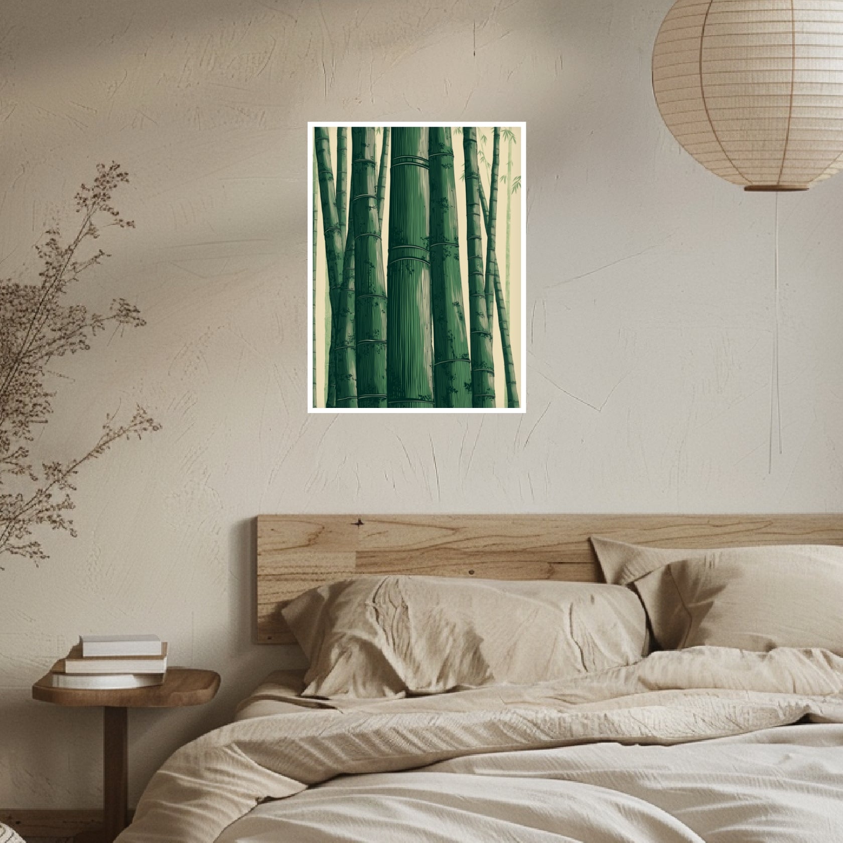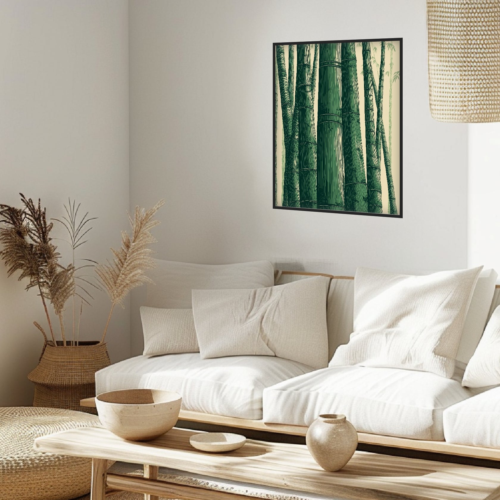 Schlanke Bambusstämme ziehen sich ruhig durch die Bildfläche und erzeugen eine klare, vertikale Ordnung. Die feinen Linien auf der Oberfläche des Bambus verleihen dem Motiv Struktur, ohne unruhig zu wirken. Sanfte Grüntöne treffen auf einen hellen Hintergrund und lassen das Licht zwischen den Formen fließen. Als Ausdruck von Japandi Style verbindet das Poster die Klarheit Japanischer Kunst mit einer stillen, natürlichen Ausstrahlung. In einem Wohnzimmer oder Flur entfaltet das Japandi Poster seine entschleunigende Wirkung und unterstützt ein zurückhaltendes Japandi Design, das Raum für Ruhe und Balance lässt.