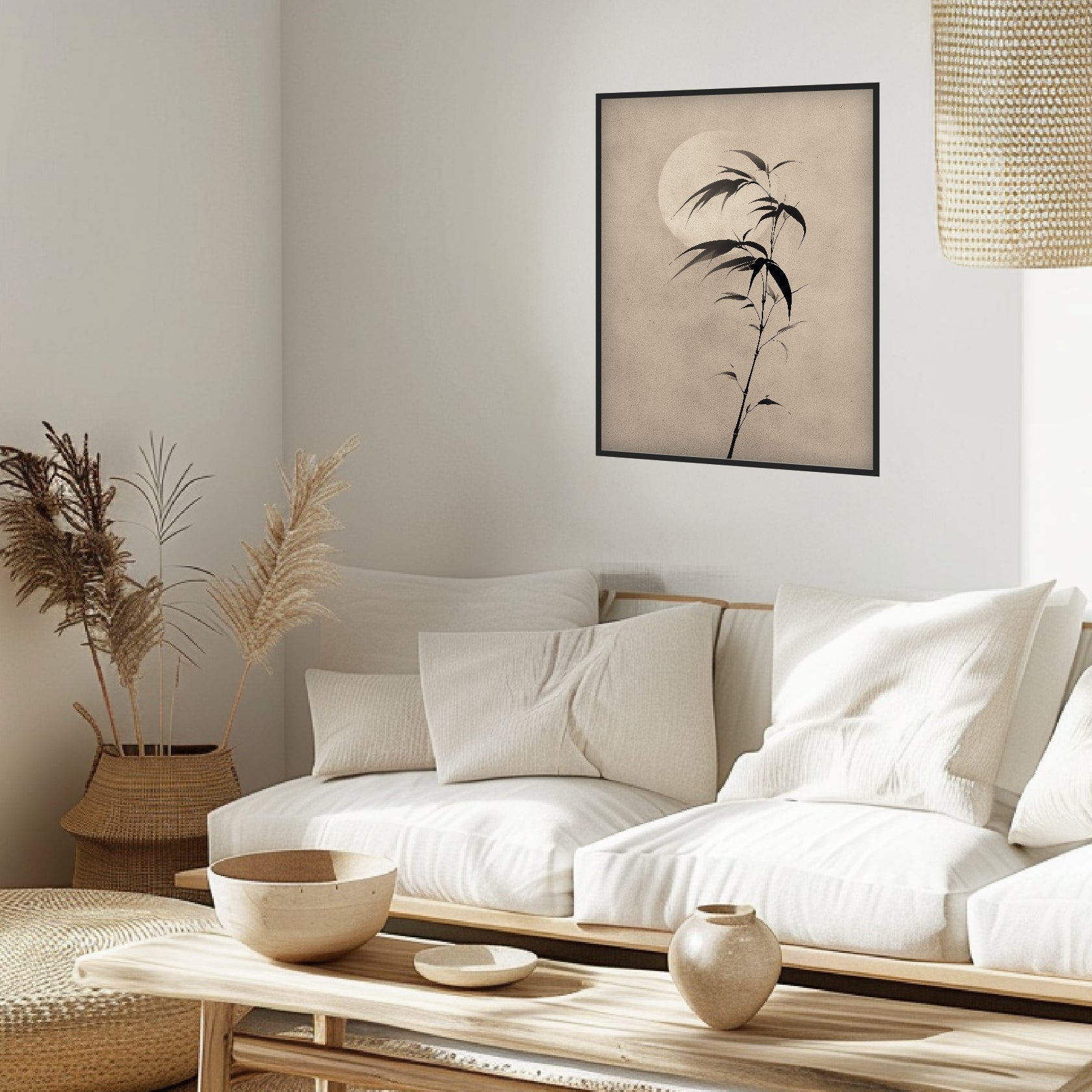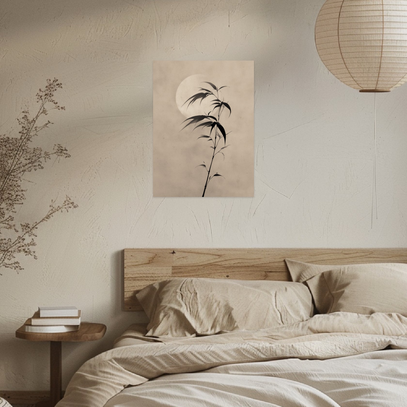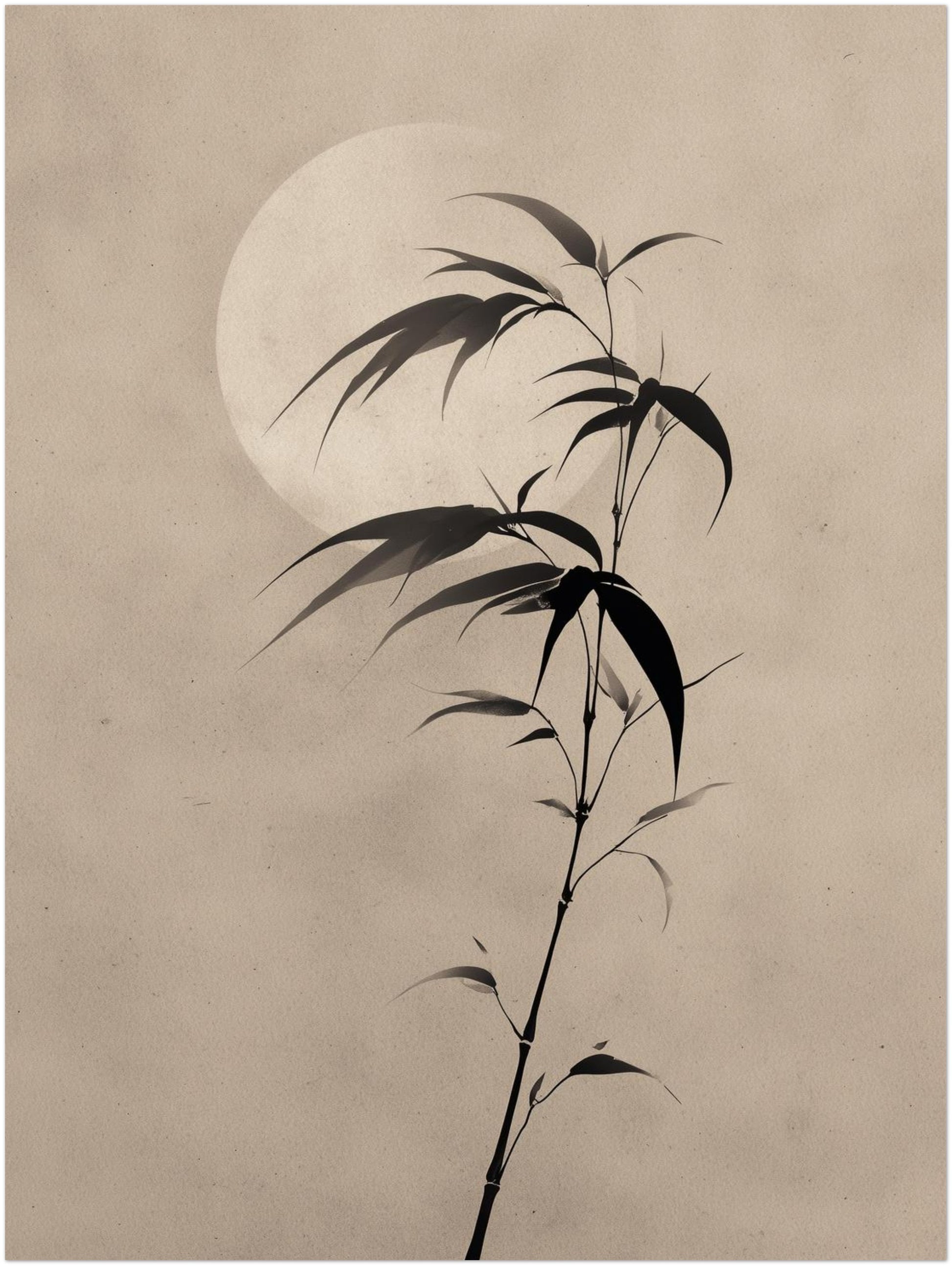 Ein milder, heller Kreis des Mondes legt sich weich hinter den filigranen Bambuszweig und lässt die feinen Schattenlinien still hervortreten. Die zarte Struktur des Papiertons schafft einen ruhigen Hintergrund, der im Schlafzimmer oder Wohnzimmer eine sanfte, kontemplative Stimmung fördert. Die reduzierte Form berührt die klare Haltung des Japandi Style und erinnert zugleich an die stille Präzision Japanischer Kunst. Als Japandi Poster wirkt das Motiv zurückhaltend und dennoch tief, während das Japandi Design durch die schlichte Komposition seine Wirkung entfaltet.
