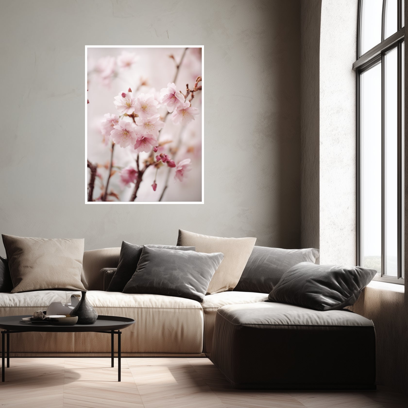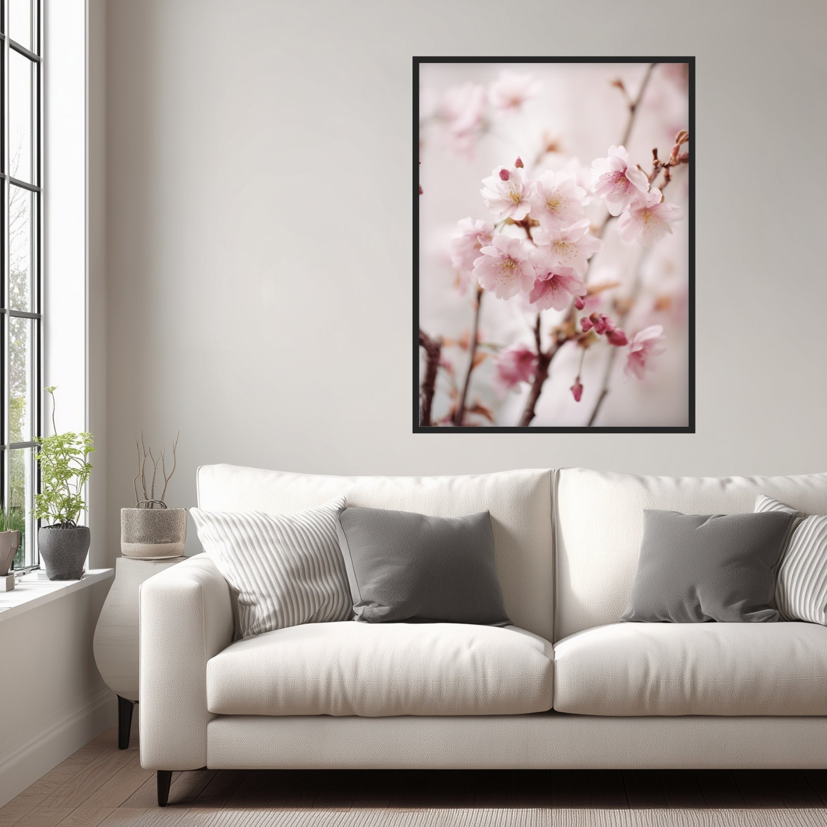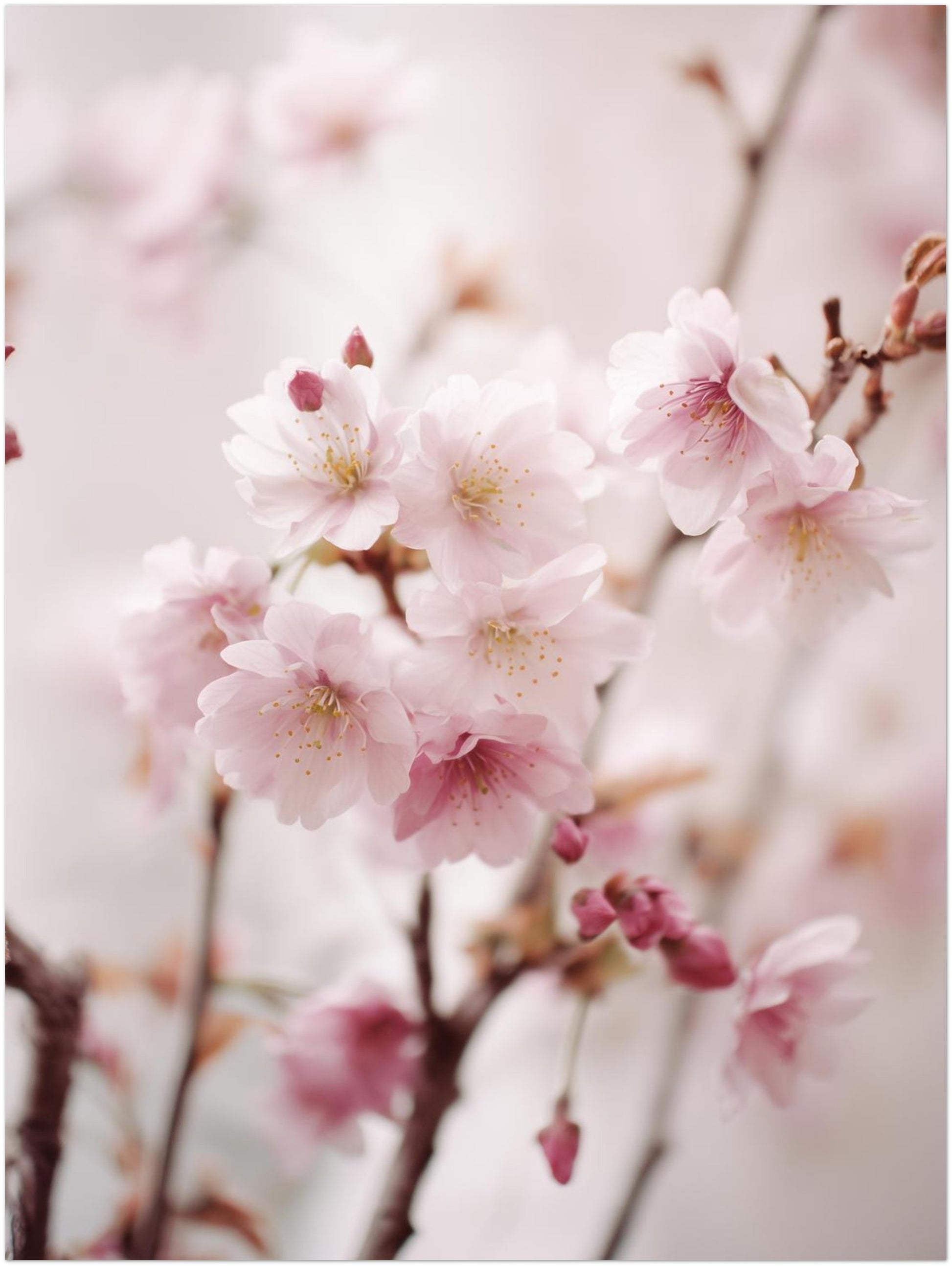 Mehrere Kirschzweige ziehen sich locker durch das Motiv und tragen zahlreiche geöffnete Blüten sowie einzelne Knospen. Die Blütenblätter sind hellrosa, fein strukturiert und heben sich ruhig vom weichen, hellen Hintergrund ab. Durch die dezente Unschärfe im Hintergrund entsteht eine klare Bildordnung, die das Motiv ruhig wirken lässt. Im Wohnzimmer oder im Flur entfaltet das Poster eine leichte, offene Atmosphäre. Die matte Darstellung unterstützt die natürliche Anmutung der Kirschzweige und fügt sich harmonisch in unterschiedliche Einrichtungsstile ein.