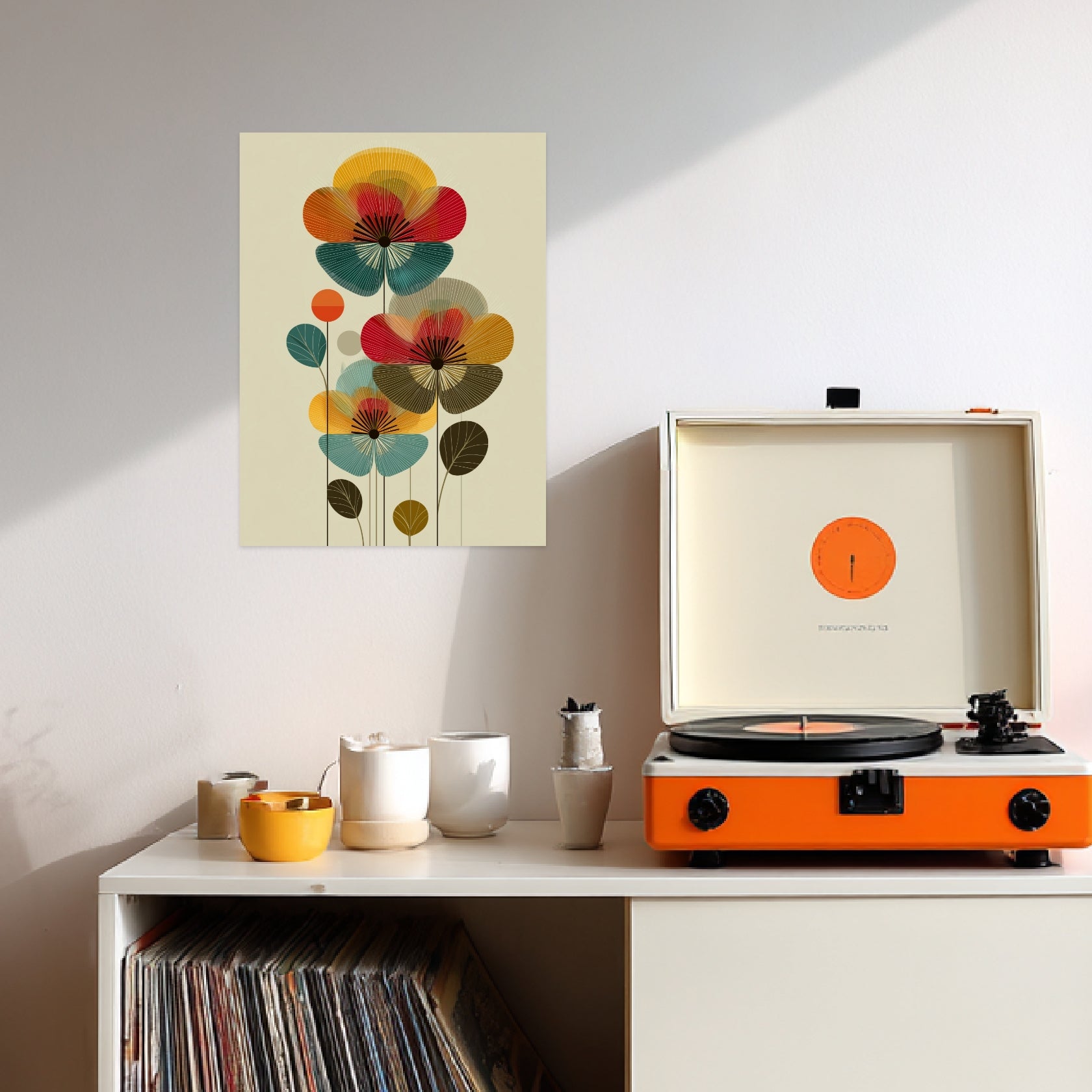 Die Blumenkomposition entfaltet sich in klar gegliederten Formen, deren Blütenblätter und Flächen in harmonischen Farbstufen angelegt sind. Sanfte Pastelltöne treffen auf warme Akzente, wodurch ein ruhiger Rhythmus entsteht, der an klassische Plakatkunst erinnert. Die analoge Körnung verleiht dem Motiv subtile Tiefe, während die geometrisch anmutende Anordnung Struktur und Ruhe erzeugt. In Wohnräumen fügt sich das Poster mühelos in moderne wie retroinspirierte Umgebungen ein: Im Wohnzimmer schafft es einen sanften Fokuspunkt, im Schlafzimmer wirkt es beruhigend und im Arbeitsbereich ordnend. Die Komposition kommuniziert stille Eleganz, getragen von Retro Design und feiner grafischer Balance im Retro Stil.