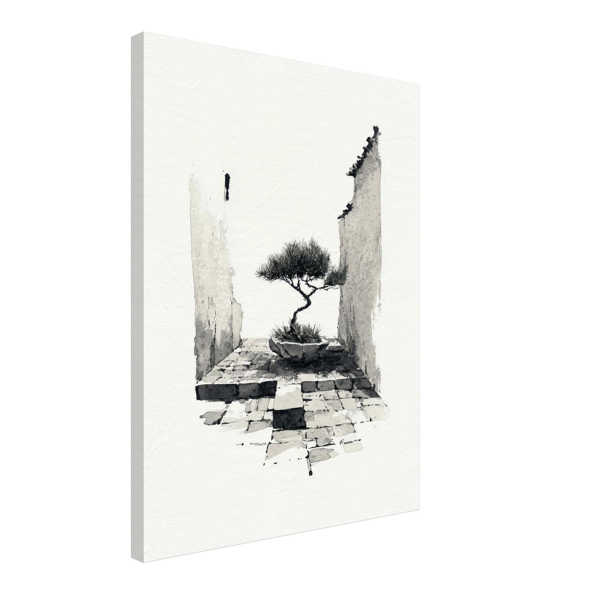 Das Bonsai in alter Mauer Leinwandbild strahlt in seiner Schlichtheit eine tiefe Ruhe aus. Der feine Schwarz-Weiß-Kontrast hebt die Struktur der alten Mauern hervor und lässt den Bonsai in seiner stillen Kraft erblühen. Diese Komposition spiegelt den Japandi Stil wider – reduziert, ausgewogen und voller innerer Klarheit. Als Japandi Wandbild verleiht es dem Japandi Interior eine ruhige, achtsame Atmosphäre. Besonders im Schlafzimmer oder Flur entfaltet es seine Wirkung als stilles Symbol für Beständigkeit, Einfachheit und die Schönheit der Leere.