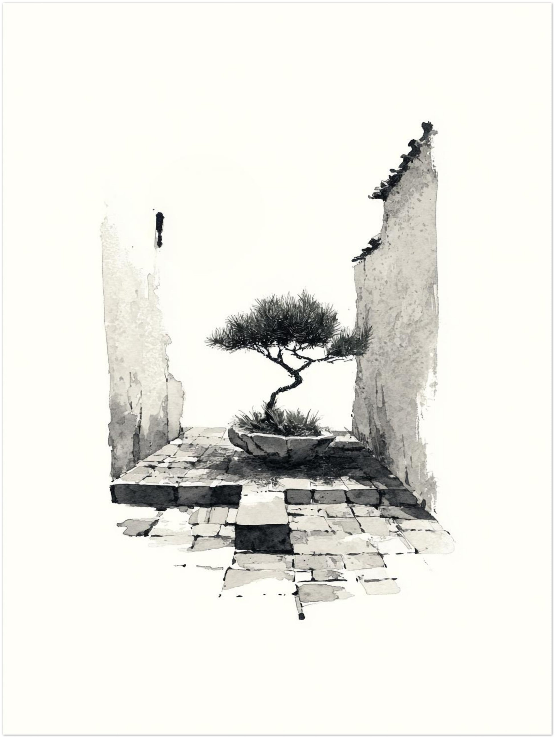 Das Bonsai in alter Mauer Poster zeigt einen zarten Baum, der inmitten alter Mauern wächst – ein Sinnbild für Ruhe und Beständigkeit. Die monochrome Gestaltung betont Licht, Schatten und Struktur und erzeugt eine Atmosphäre von meditativer Stille. In dieser Einfachheit offenbart sich der Geist des Japandi Style: klare Linien, natürliche Formen und bewusste Leere. Dieses Japandi Poster bringt Ruhe in Räume wie Schlafzimmer oder Flur und erinnert an die Schönheit des Unvollkommenen. Es steht für das Prinzip des Japandi Design, in dem Harmonie und Achtsamkeit in Einklang kommen.