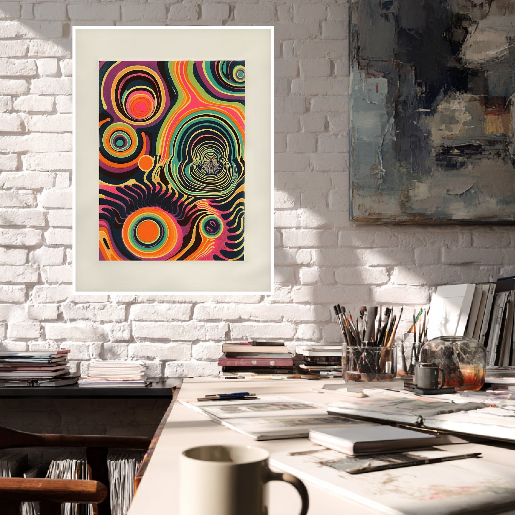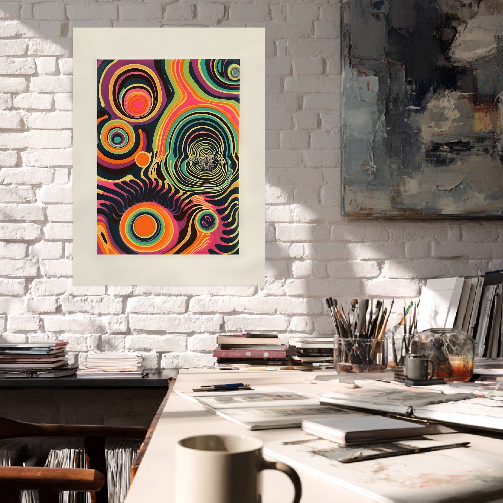 Ein kaleidoskopischer Aufbau aus strahlenden Farbringen entfaltet sich in diesem Motiv wie ein pulsierendes Echo, das den Blick sanft in seine rhythmischen Bahnen hineinzieht. Die ineinander verschlungenen Ringe leuchten in warmen Orangen, vibrierenden Pinktönen und kühlen Türkisnuancen und bilden ein Netzwerk aus Kurven, das die dynamische Essenz von Psychedelic atmet. Als Psychedelic Art Poster wirkt das Werk besonders im Flur beeindruckend, wo seine kontrastreichen Schwingungen den Raum optisch öffnen. Die harmonische Anordnung der Kreise erzeugt einen organischen Psychedelic Style, der wie ein strahlender Impuls durch die gesamte Komposition wandert und eine inspirierende visuelle Energie entfaltet.