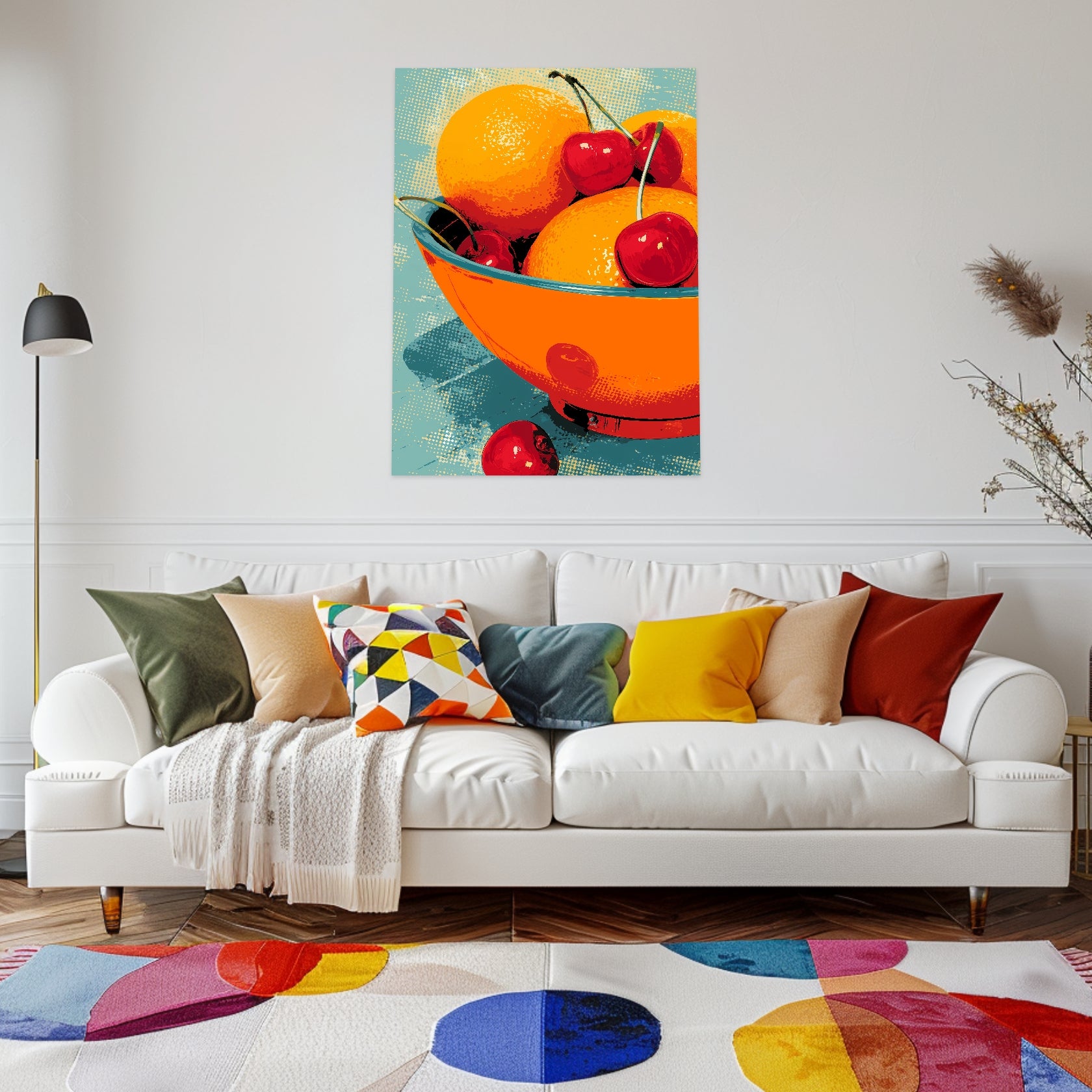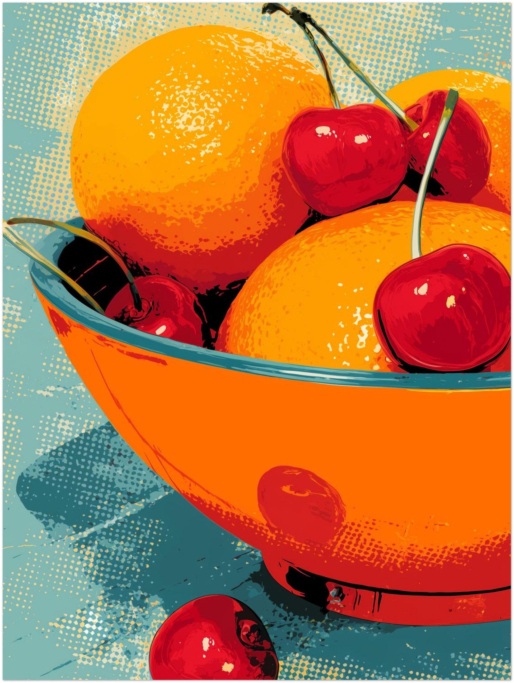 Energie in reiner Farbform: Die bunte Obstschale zeigt Orangen und Kirschen in intensiven, glänzenden Farbtönen, die durch klare Konturen und punktierte Schattierungen einen ikonischen Pop-Art-Charakter erhalten. Der türkisfarbene Untergrund setzt einen kraftvollen Kontrast zu den warmen Orange- und Rottönen und erzeugt eine dynamische Bildspannung. Perfekt für Küchen oder Essbereiche, die nach einem modernen, lebendigen Statement suchen. Dieses Poster vereint die plakative Wirkung eines Pop Art Poster mit der kreativen Freiheit von Popular Art, unterstützt durch markante Pop Art Motive und einen klaren Popart Stil.