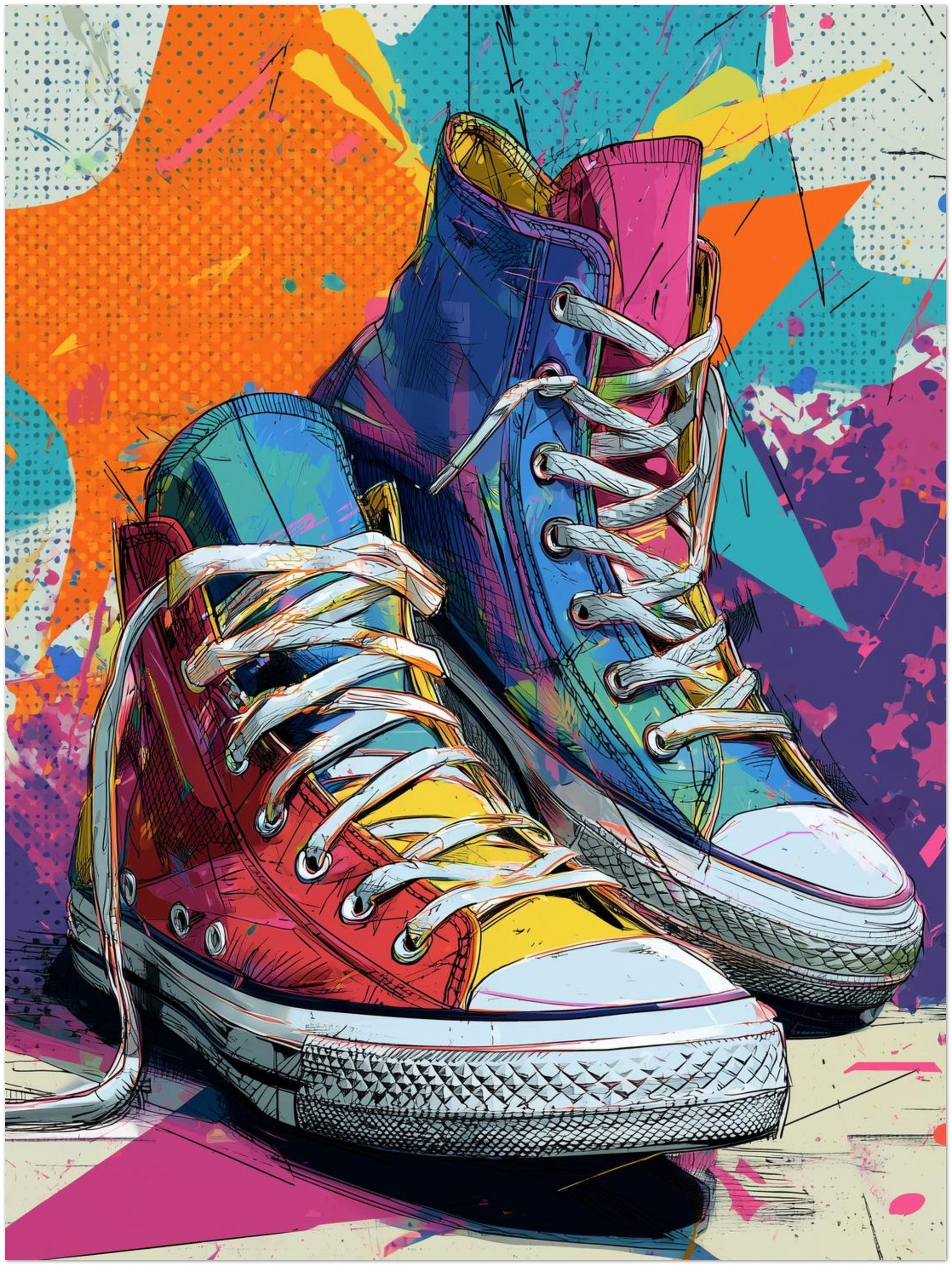 Ein Bild, das laut spricht: Zwei bunte Sneaker stehen lässig voreinander, als wären sie gerade aus einer urbanen Szene herausgeschnitten. Die Farbkombination – Rot, Gelb, Blau und Pink – pulsiert vor Energie, während skizzenhafte Linien dem Motiv einen rebellisch-handgezeichneten Charakter verleihen. Der Hintergrund mit seinen Splash-Effekten und geometrischen Farbflächen sorgt für zusätzlichen Drive und lenkt den Blick direkt auf die Schuhe. In Flur oder Jugendzimmer wird dieses Poster zum mutigen Stilstatement. Es vereint typische Elemente eines Pop Art Poster mit der Freiheit von Popular Art, expressiven Pop Art Motive und einem lebendigen Popart Stil.