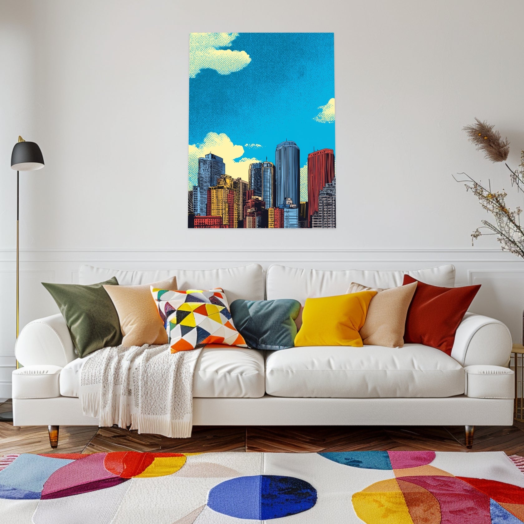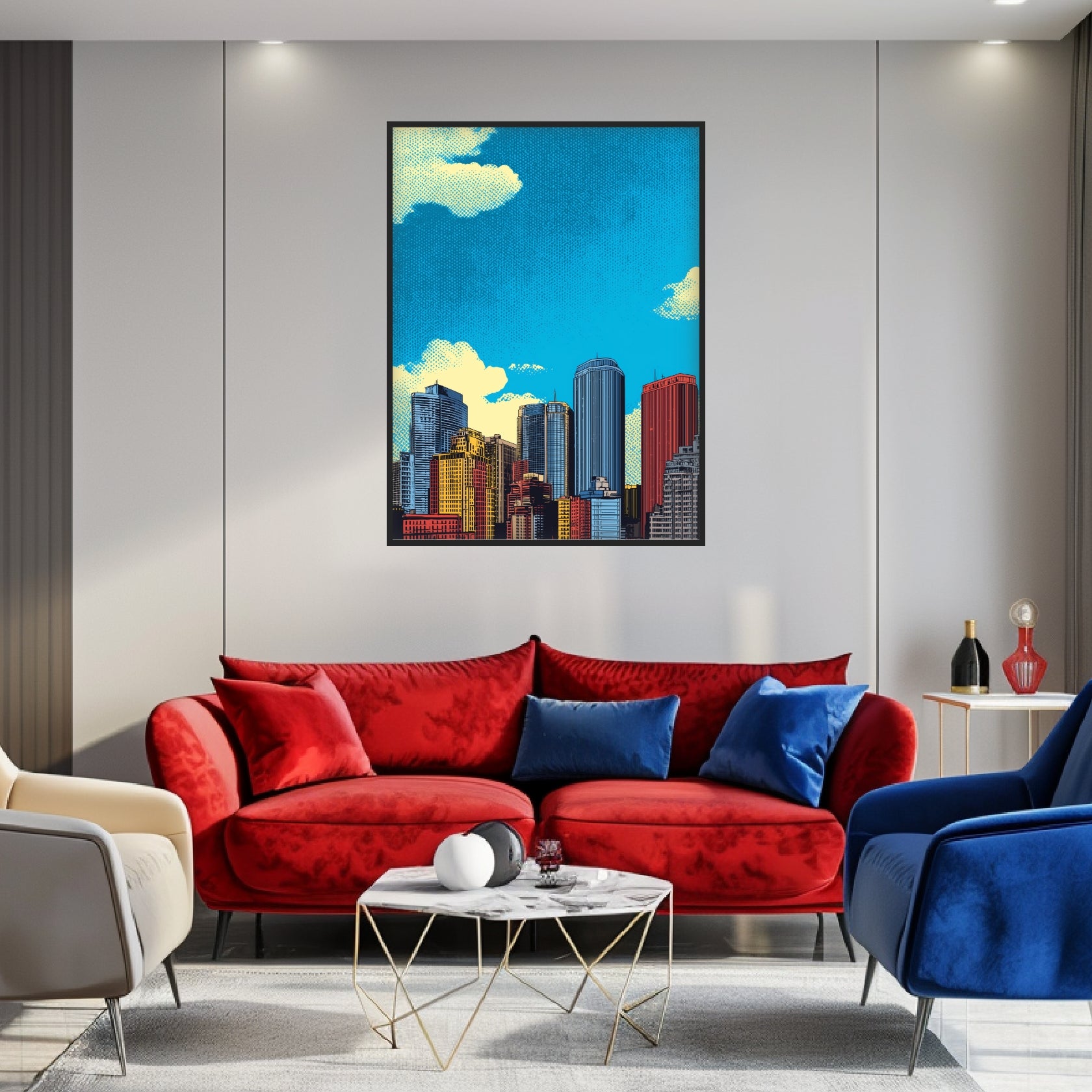 Die Skyline erhebt sich kraftvoll vor dem Himmel, jedes Gebäude klar gezeichnet, jede Farbe bewusst gesetzt. Gelb, Rot und Blau treffen aufeinander und erzeugen eine vibrierende Stadtszene im Geist der Popular Art. Als Pop Art Poster bringt dieses Motiv urbane Weite und grafische Präzision an die Wand. Die markanten Pop Art Motive erinnern an Comic-Panels und moderne Architekturillustrationen. Der prägnante Popart Stil macht das Poster ideal für Wohnzimmer oder Flur mit urbanem Charakter und kreativer Haltung.