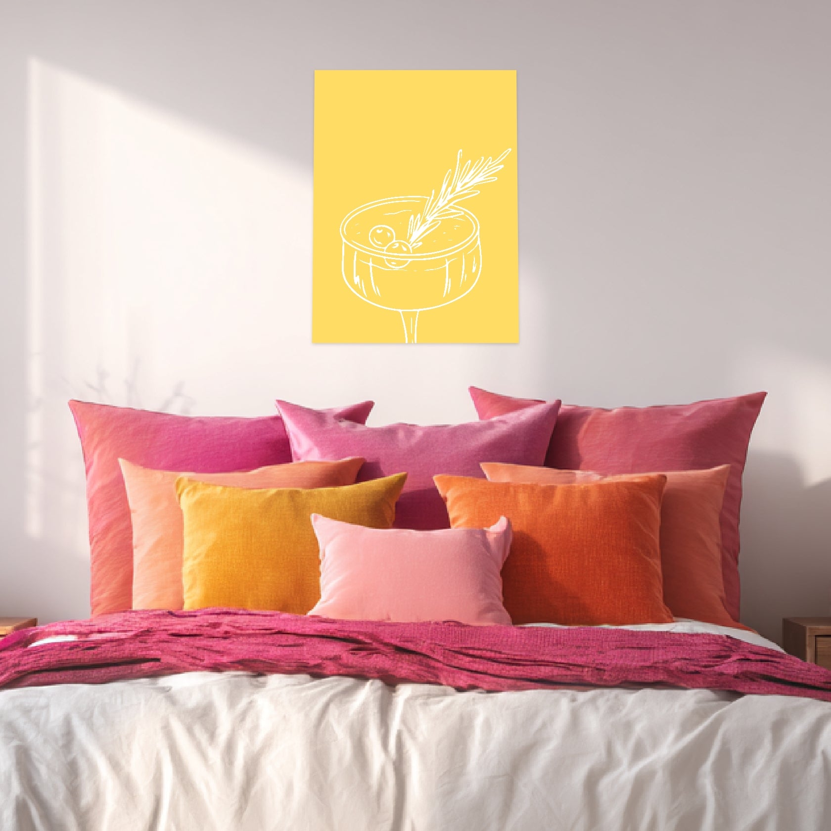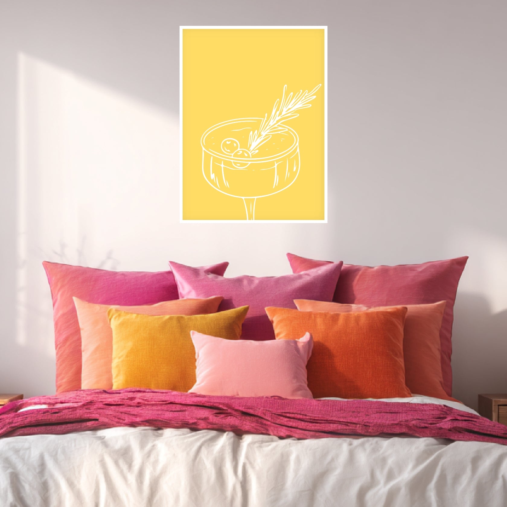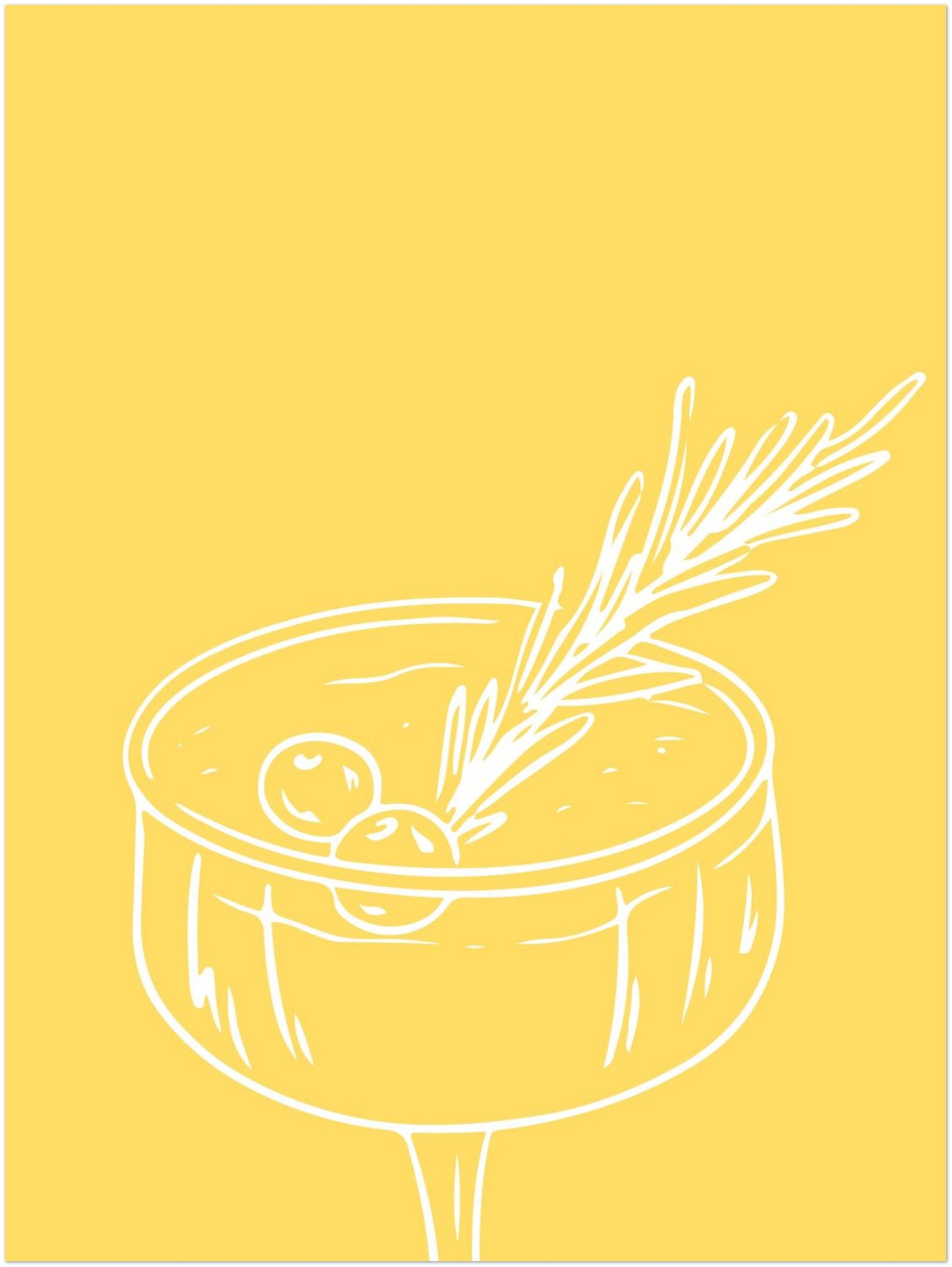 Ein gelbes Strahlen, das sofort gute Laune weckt – das Dopamine Decor Poster „Cocktailglas mit Zweig gelb“ kombiniert sonnige Leuchtkraft mit klarer grafischer Eleganz. Die feinen weißen Linien formen ein stilvolles Cocktailglas, in dem sich Natürlichkeit und Design vereinen. Dieses Kunstwerk entfaltet seine volle Wirkung besonders im Flur oder in der Küche, wo es mit seiner frischen Farbigkeit den Raum belebt. Das Poster steht für den typischen Dopamine Style – leicht, energiegeladen und inspirierend. Eine moderne Dopamine Deko voller Ausdruckskraft und feiner Dopamine Art.