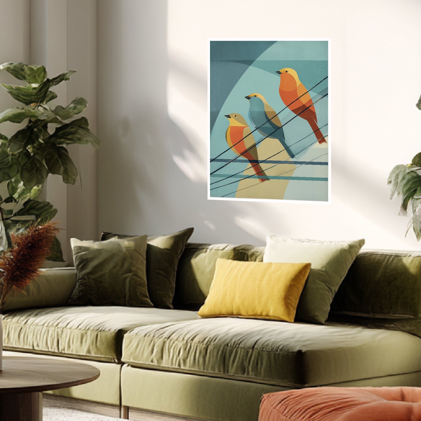 Das Poster zeigt drei stilisierte Voegel, die in ruhiger Abfolge auf einem Draht sitzen. Ihre Körper sind aus klaren, geometrischen Flächen aufgebaut, die sich sanft überlagern und eine subtile Tiefenwirkung erzeugen. Die Farbpalette ist warm und ausgewogen, mit gedämpften Blau-, Gelb- und Orangetönen, die an klassische Druckgrafik erinnern. Feine Linien durchziehen das Motiv und geben ihm Struktur, ohne Unruhe zu erzeugen. Als Retro Poster vermittelt das Bild eine leise Nostalgie und fügt sich harmonisch in Wohnzimmer, Flur oder Büro ein. Die reduzierte Gestaltung im Retro Stil schafft Raum für Ruhe und Konzentration und macht diesen Kunstdruck Retro zu einem zeitlosen Wandelement.
