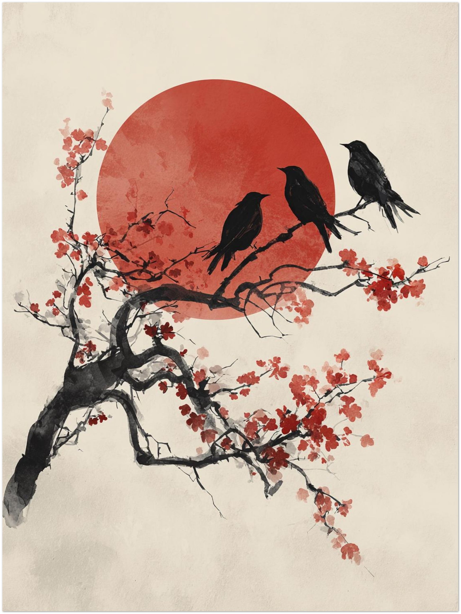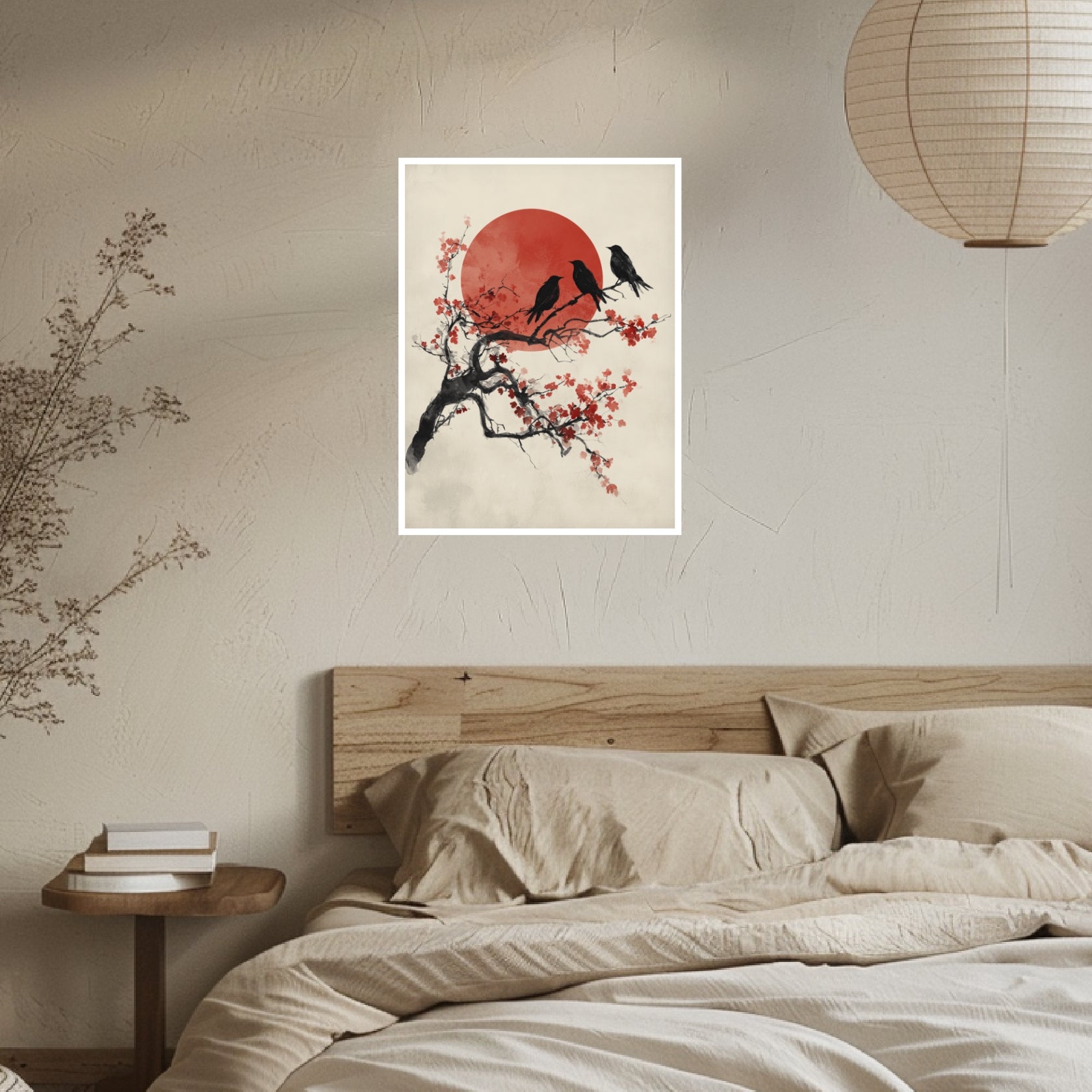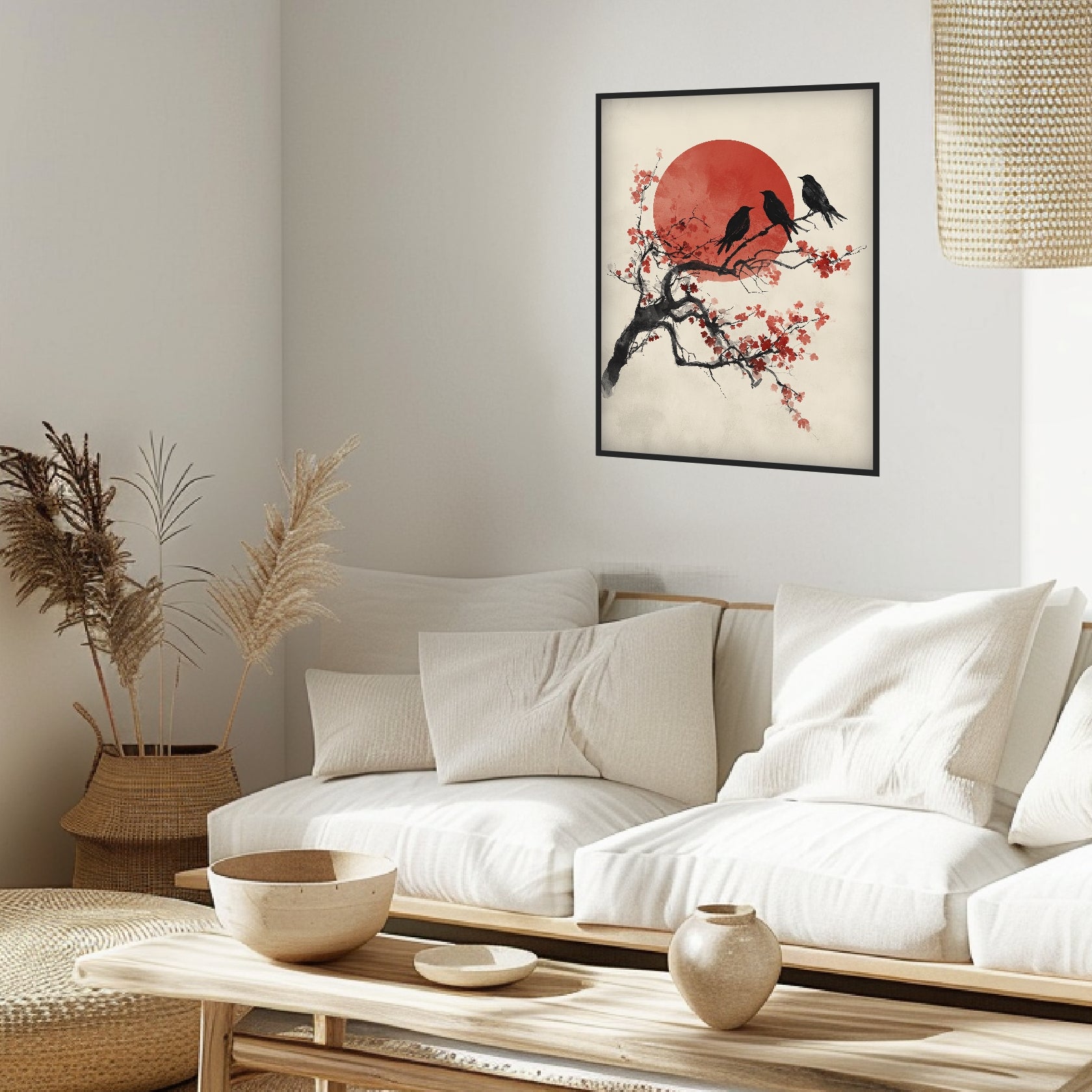 Das Drei Vögel auf Kirschblütenzweig Poster zeigt eine feine Komposition aus Bewegung und Ruhe. Drei schwarze Vögel sitzen auf einem blühenden Ast, während ein roter Kreis im Hintergrund die Sonne symbolisiert. Die zarten Kirschblüten breiten sich wie Gedanken im Wind aus, leicht und vergänglich. In dieser Reduktion liegt die Tiefe – der japandi style wird spürbar durch die Harmonie von Leere und Form, Stille und Leben. Dieses Kunstwerk entfaltet in einem Schlafzimmer oder Wohnzimmer eine sanfte Präsenz, die die Achtsamkeit des japandi design und die stille Würde japanische kunst verkörpert.