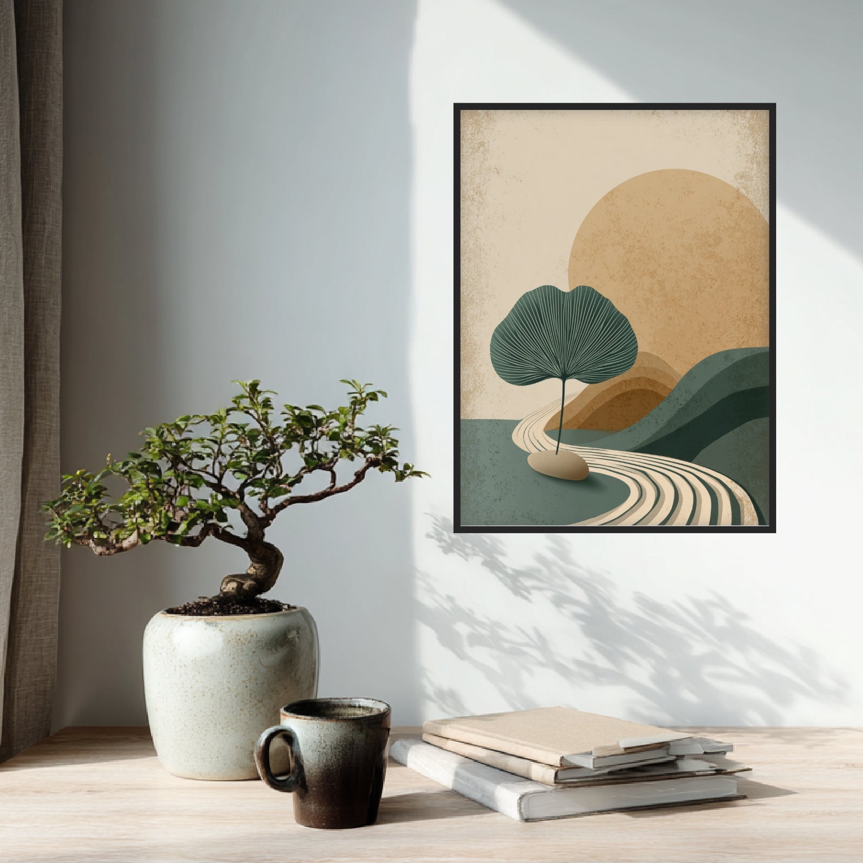 Das Motiv zeigt einen einzelnen Blattbaum, der auf einem glatten Stein ruht und von sanft geschwungenen Linien umgeben ist. Die Landschaft wirkt ruhig und weit, während die warmen Farbtöne eine weiche Atmosphäre erzeugen. Der Baum entfaltet sich in klaren Linien, die an einen stillen Moment der Sammlung erinnern. Die Komposition öffnet einen Raum, der den Blick ohne Eile führt und eine feine Balance zwischen Struktur und Stille schafft. Besonders im Wohnzimmer oder Schlafzimmer kann dieses Bild einen ruhigen Fokuspunkt setzen. Die klare Formensprache verbindet sich mit Zen Poster und Zen Poster Art.