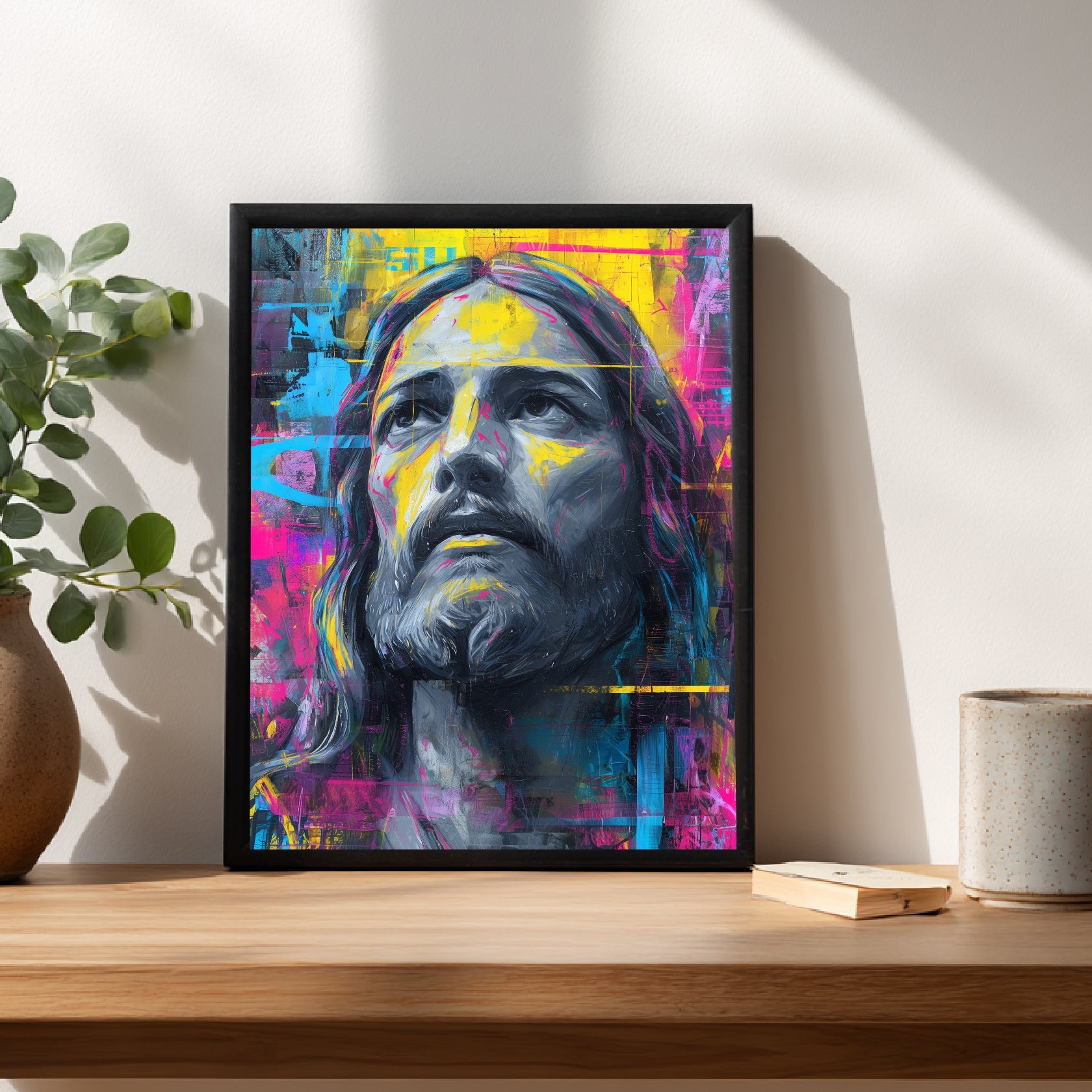 In diesem Werk verbinden sich kraftvolle Farbimpulse mit einer fein modellierten Darstellung des Antlitzes Jesu. Die farbgesättigten Ebenen scheinen sich wie transparente Schleier übereinanderzulegen und öffnen ein Feld stiller Betrachtung. Die Linienführung im Gesicht ist weich, doch klar umrissen, wodurch sich Ausdruck und Tiefe gegenseitig verstärken. Gelbe Akzente lenken das Licht behutsam über Stirn und Wangen, während Blau- und Rosatöne die Konturen in ein meditatives Umfeld betten. Die gesamte Komposition strahlt eine ruhige, innere Ausrichtung aus, ideal für das Wohnzimmer oder den Flur. Durch die Kombination zeitgenössischer Texturen entsteht ein harmonischer Einklang, der die Bedeutung von Christliche Poster feinfühlig unterstreicht.