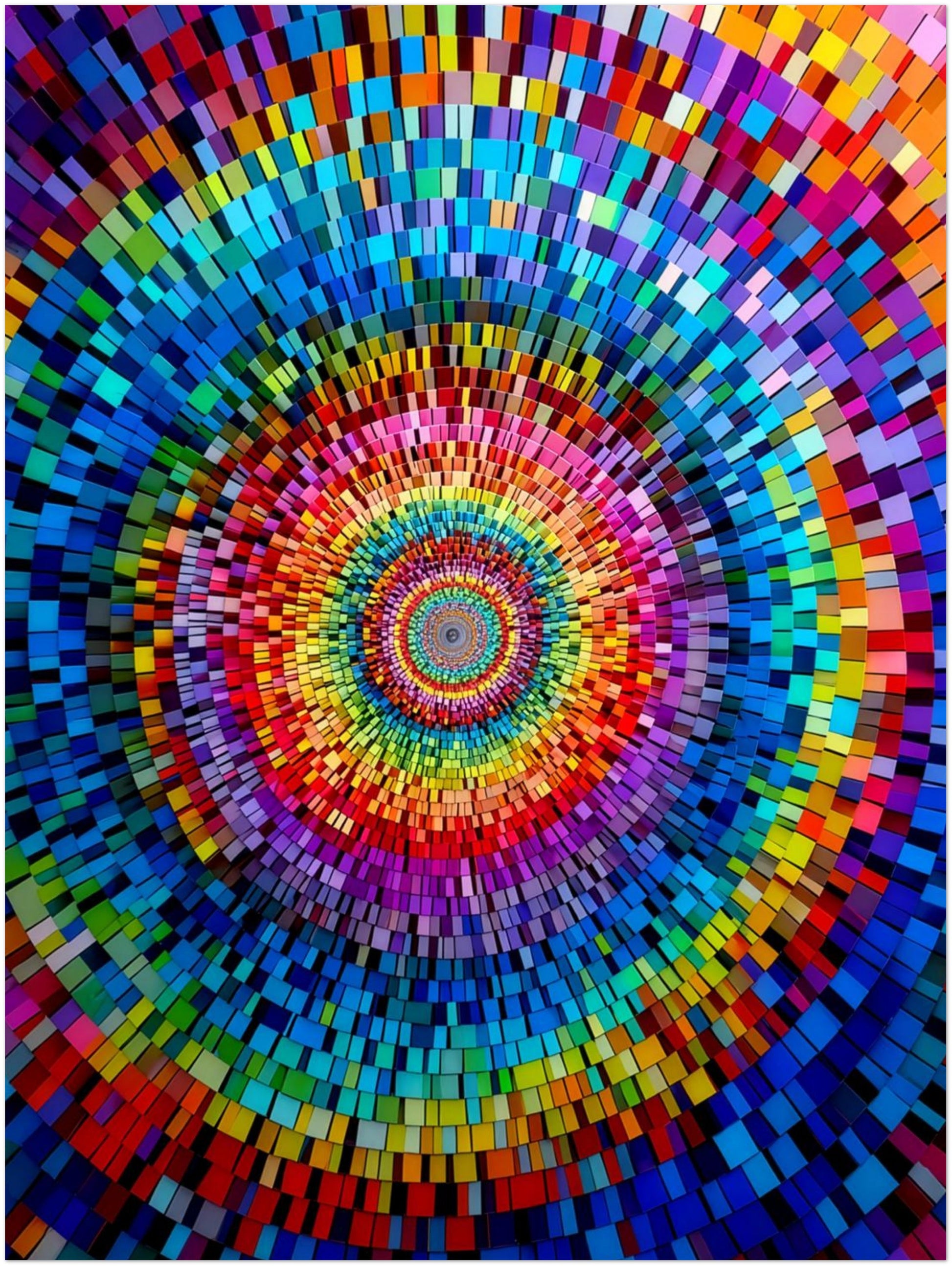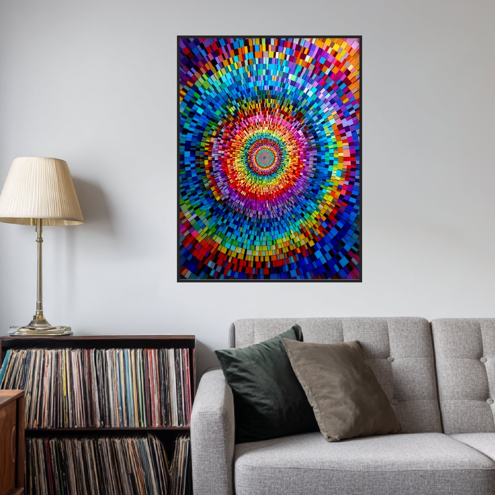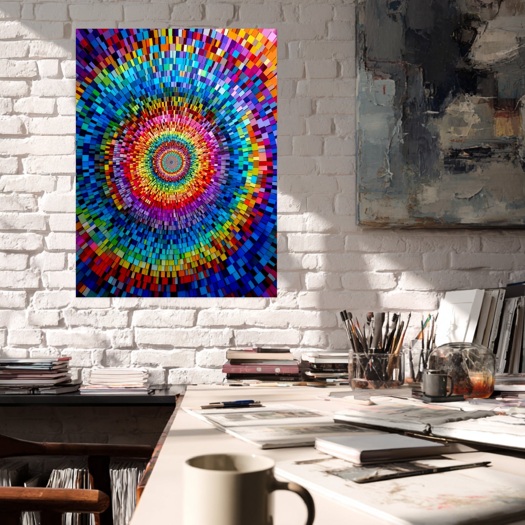 Ein lebendiger Kreis aus farbigen Segmenten bildet den Kern dieses farbintensiven Kreismosaiks und erzeugt eine faszinierende Strahlkraft, die sich gleichmäßig über die gesamte Fläche verteilt. Die klar gesetzten Mosaiksteine wirken wie kleine, leuchtende Fragmente, die sich in rhythmischer Abfolge ausbreiten und ein dynamisches Farbspiel entstehen lassen. Die sanften Übergänge zwischen warmen und kühlen Tönen betonen die optische Tiefe und verleihen dem Motiv einen charakteristischen Psychedelic Ausdruck. Als auffälliges Psychedelic Art Poster eignet es sich besonders für das Wohnzimmer, wo die konzentrischen Farbkreise ihre volle Wirkung entfalten. Die harmonische Kombination aus Struktur und Farbfluss unterstreicht den lebhaften Psychedelic Style und schenkt dem Raum eine stimulierende, visuell kraftvolle Atmosphäre.