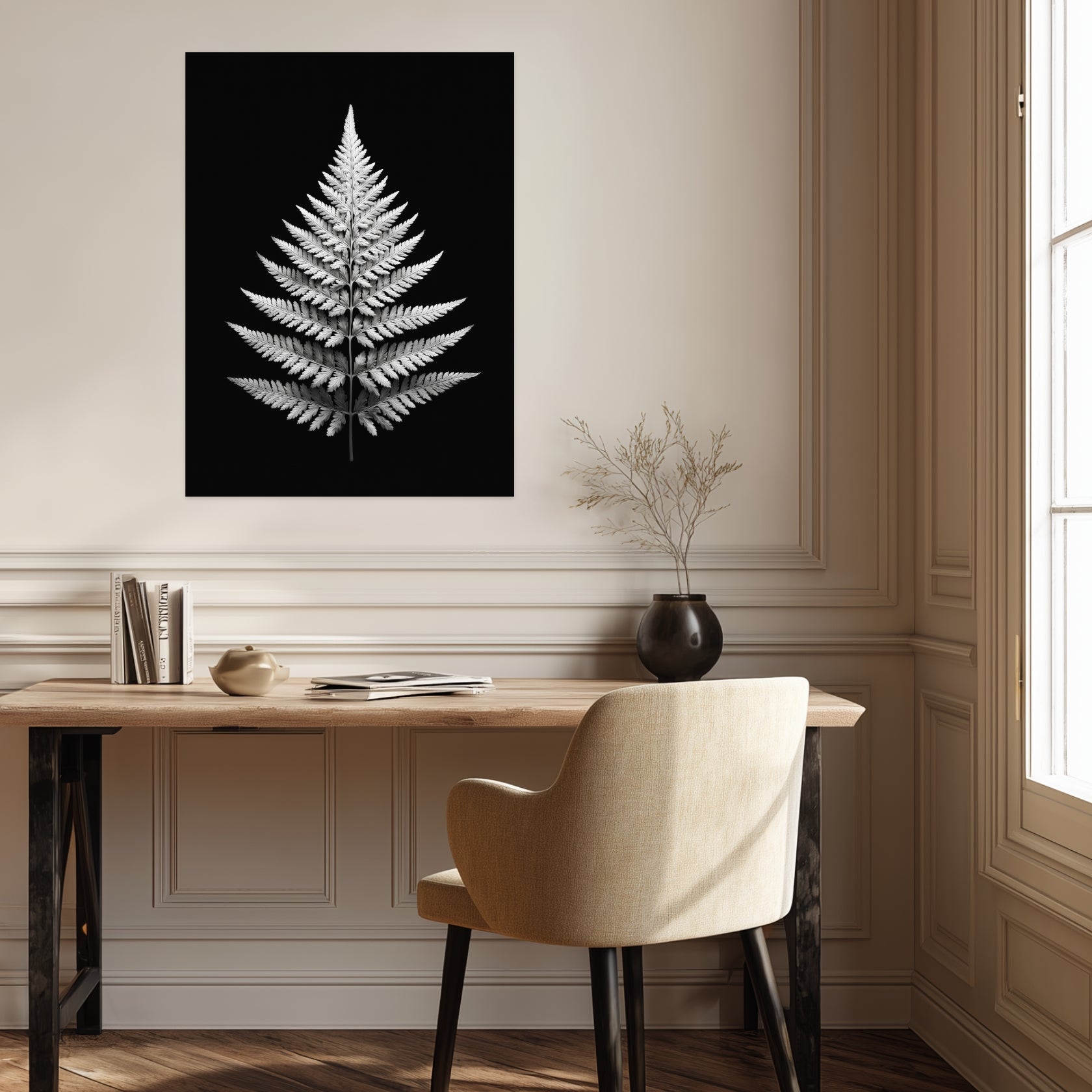 Ein einzelnes Farnblatt steht im Zentrum und entfaltet seine Form in vollkommener Ausrichtung. Im Farnblatt Symmetrie Poster wird jede Verzweigung sichtbar, jede Linie folgt einer ruhigen Ordnung. Die Schwarz Weiß Darstellung verstärkt den Kontrast zwischen Blatt und Hintergrund und lässt die Struktur klar hervortreten. Als Schwarz Weiß Poster unterstützt das Motiv eine reduzierte Raumwirkung. Besonders im Wohnzimmer oder im Flur entsteht eine stille Atmosphäre, geprägt von Klarheit und natürlicher Balance.
