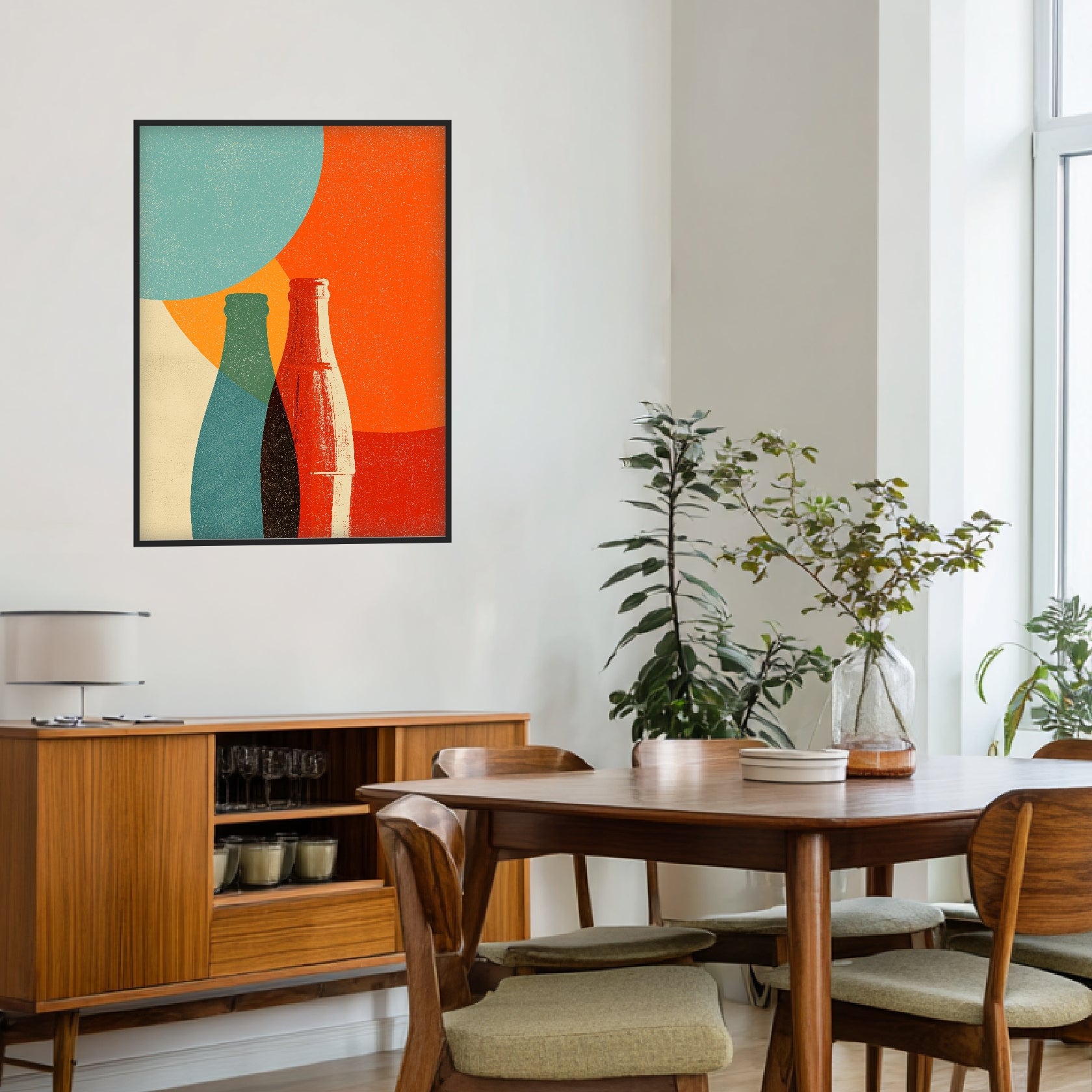 Das Poster zeigt zwei überlagerte Flaschensilhouetten, die sich vor weiten Farbflächen in Orange, Blaugrün und hellen Naturtönen abzeichnen. Die Komposition lebt von ruhigen Rundungen, klaren Linien und einer analogen Körnung, die an traditionelle Druckverfahren erinnert. Die überlappenden Formen erzeugen ein grafisches Spiel aus Transparenzen und Schatten, wodurch eine subtile räumliche Tiefe entsteht. In Innenräumen wirkt das Bild geordnet, warm und zeitlos – ein stiller, grafischer Akzent für Wohnzimmer, Flur oder Büro. Die Gestaltung verbindet schlichte Formensprache mit klassischer Plakatästhetik und entfaltet ihre Wirkung im Retro Stil sowie als feiner Kunstdruck Retro.