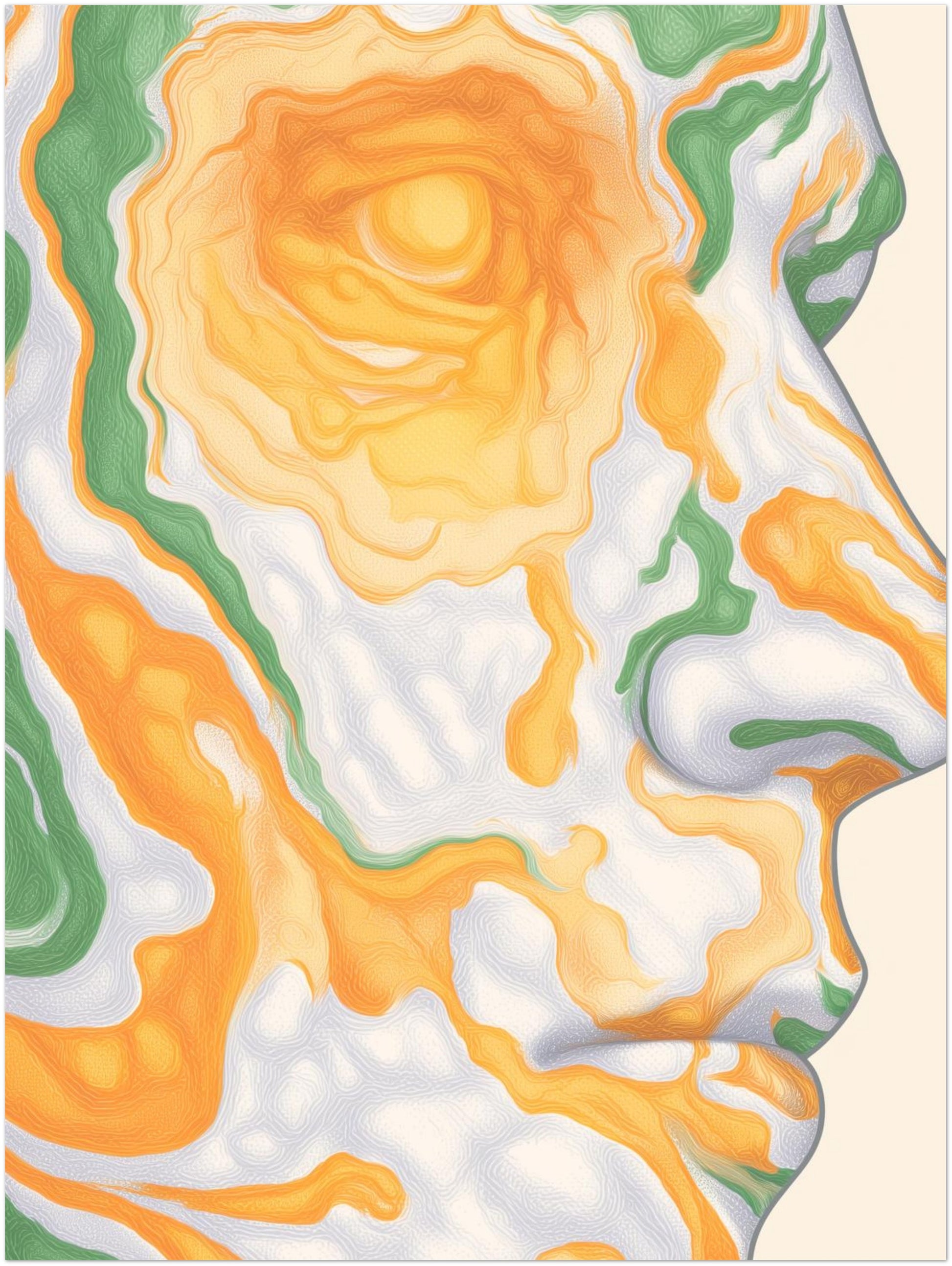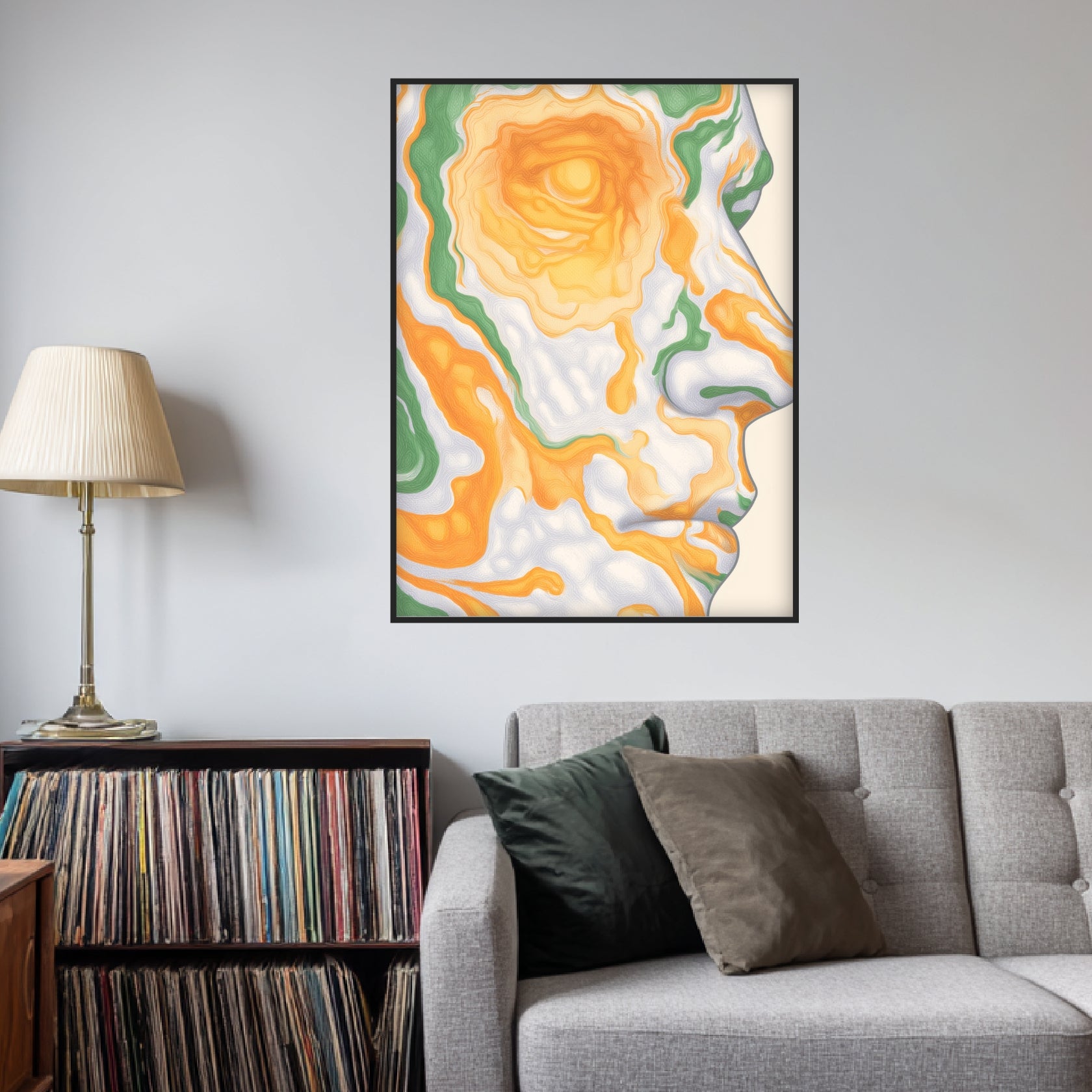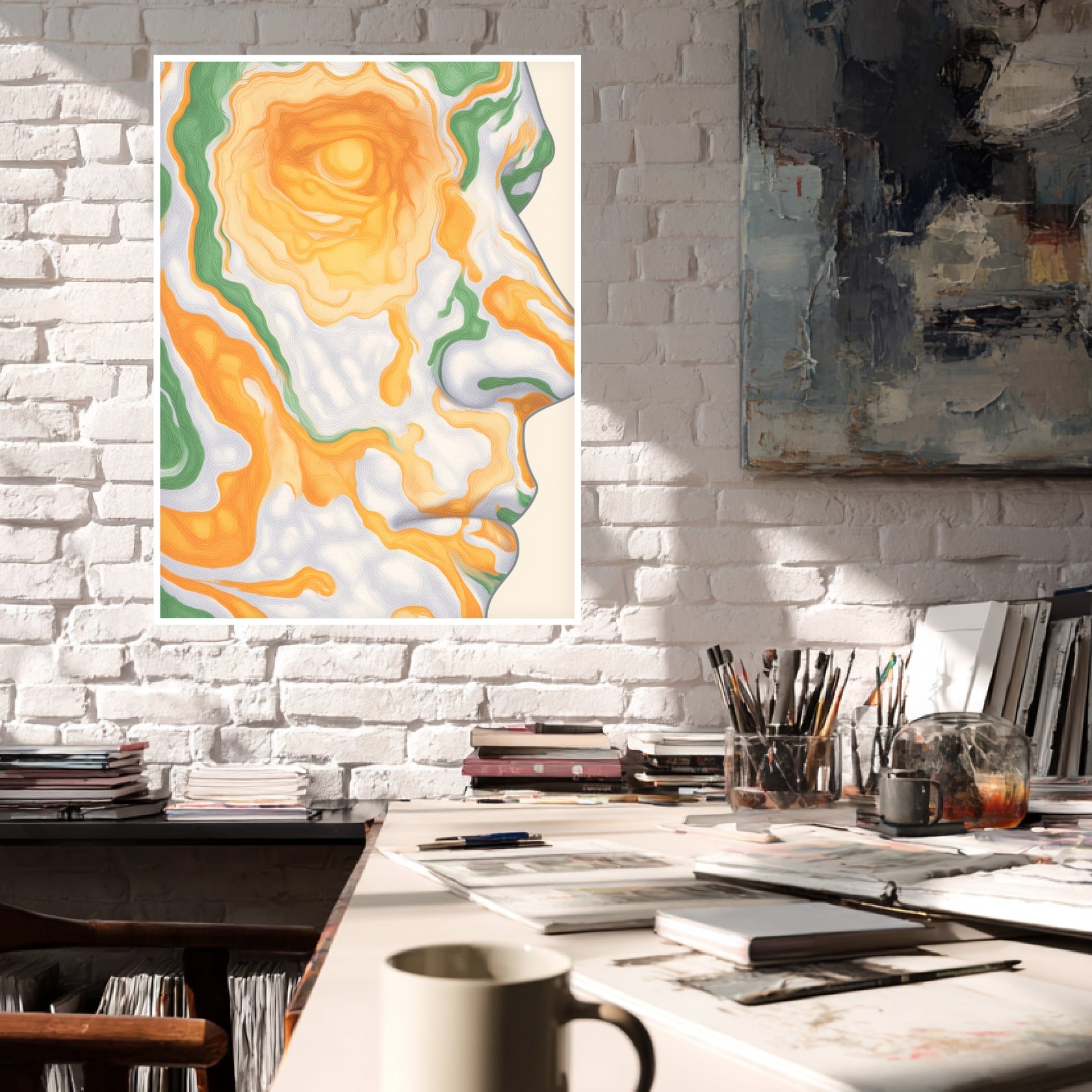 Wie aus schmelzender Farbe geformt, zeigt dieses Motiv ein Gesichtsprofil, das sich aus sanften Übergängen und ruhigen Linien zusammensetzt. Gelb-orange Lichtakzente wirken wie innere Energie, während grüne und helle Flächen Ausgleich und Weite schaffen. Das Psychedelic Zusammenspiel von Form und Farbe erzeugt eine stille Dynamik, die lange nachwirkt. Als Psychedelic Art Poster eignet sich das Motiv besonders für das Wohnzimmer oder Schlafzimmer, wo es eine entspannte, kreative Atmosphäre unterstützt. Der fein ausbalancierte Psychedelic Style verbindet emotionale Tiefe mit zeitgemäßer Ästhetik.