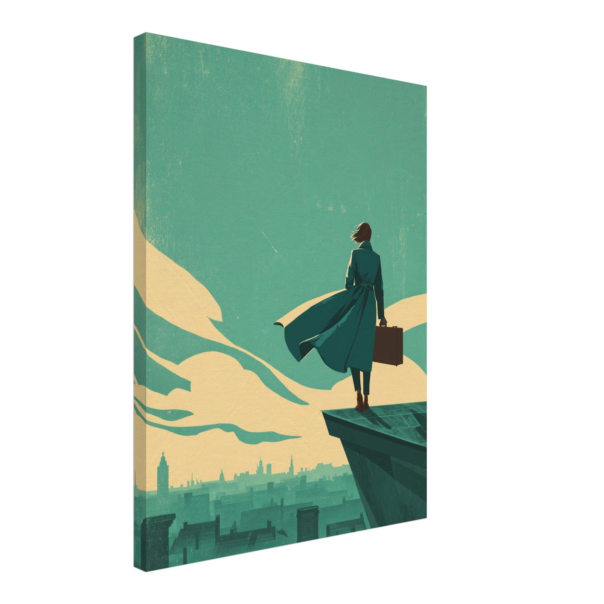 Auf der Leinwand wirkt Frau mit Koffer ruhig und zugleich spannungsvoll. Die Figur steht im Vordergrund, klar konturiert vor einem weiten Himmel und einer stilisierten Stadtsilhouette. Licht und Schatten sind weich abgestimmt und verleihen dem Motiv eine analoge Tiefe. Die sichtbare Leinwandstruktur unterstützt den grafischen Charakter und verstärkt die warme Ausstrahlung. Als Retro Leinwandbild fügt sich das Motiv harmonisch in moderne Wohnräume ein. Die zurückhaltende Retro Art schafft eine ruhige Atmosphäre und lädt zum Innehalten und Weiterdenken ein.