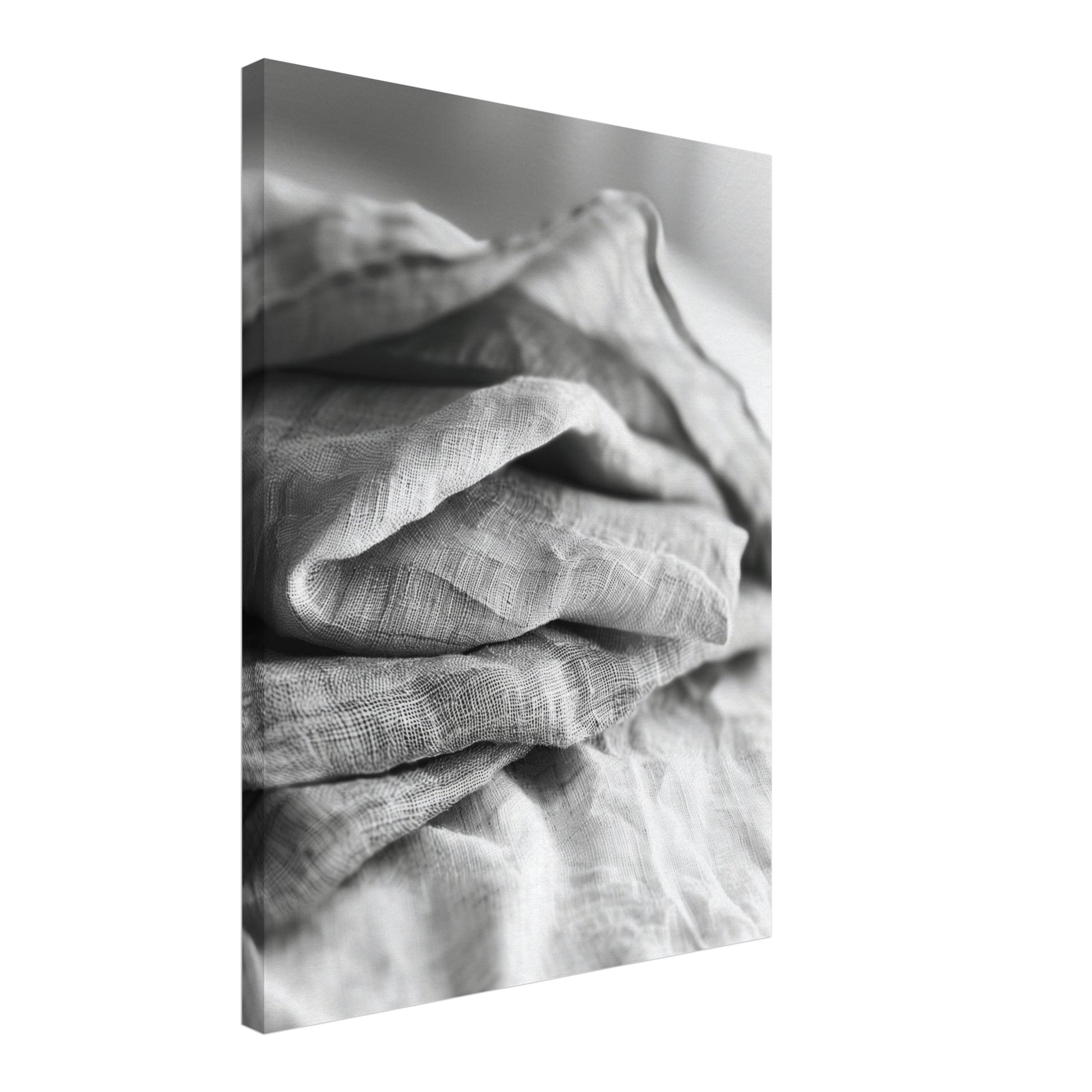 Die Leinwand trägt das Motiv mit spürbarer Ruhe. Gefaltete Stofflagen bilden eine sanfte Landschaft aus Linien und Flächen. Grauabstufungen verlaufen weich, Licht legt sich gleichmäßig über das Gewebe. Die Leinwandstruktur verstärkt die Nähe zum Material und vertieft die Wirkung der Oberfläche. Im Schlafzimmer oder im Wohnzimmer fügt sich das Bild unaufdringlich ein und schafft eine zeitlose Raumstimmung, geprägt von Klarheit und stiller Präsenz.