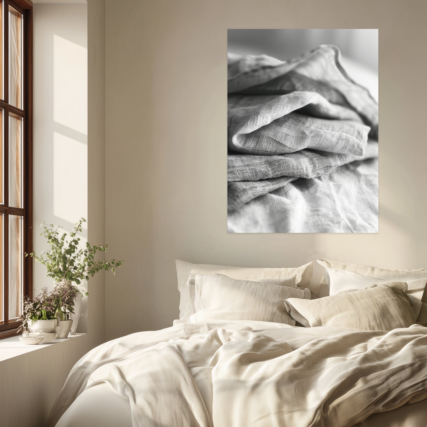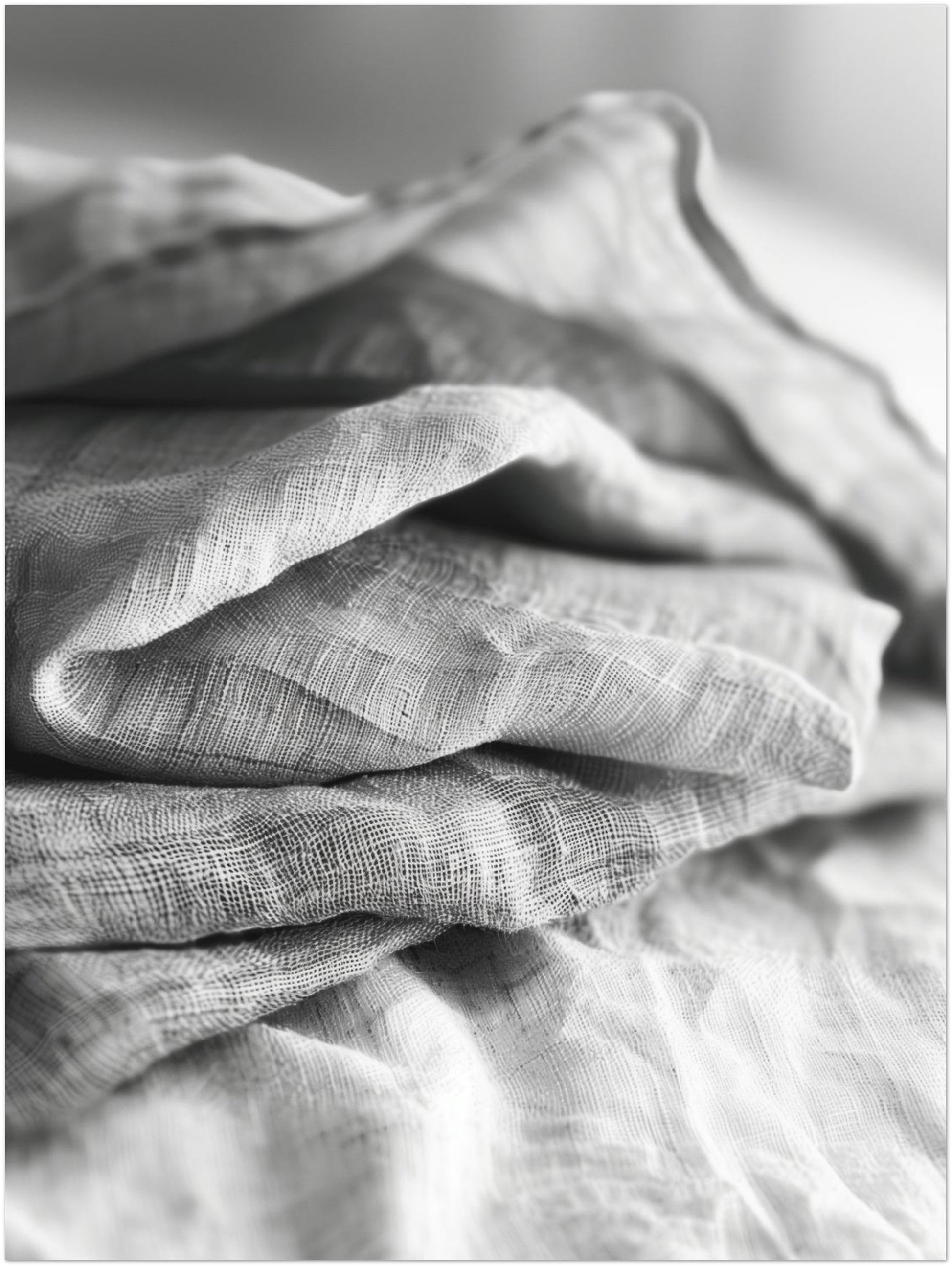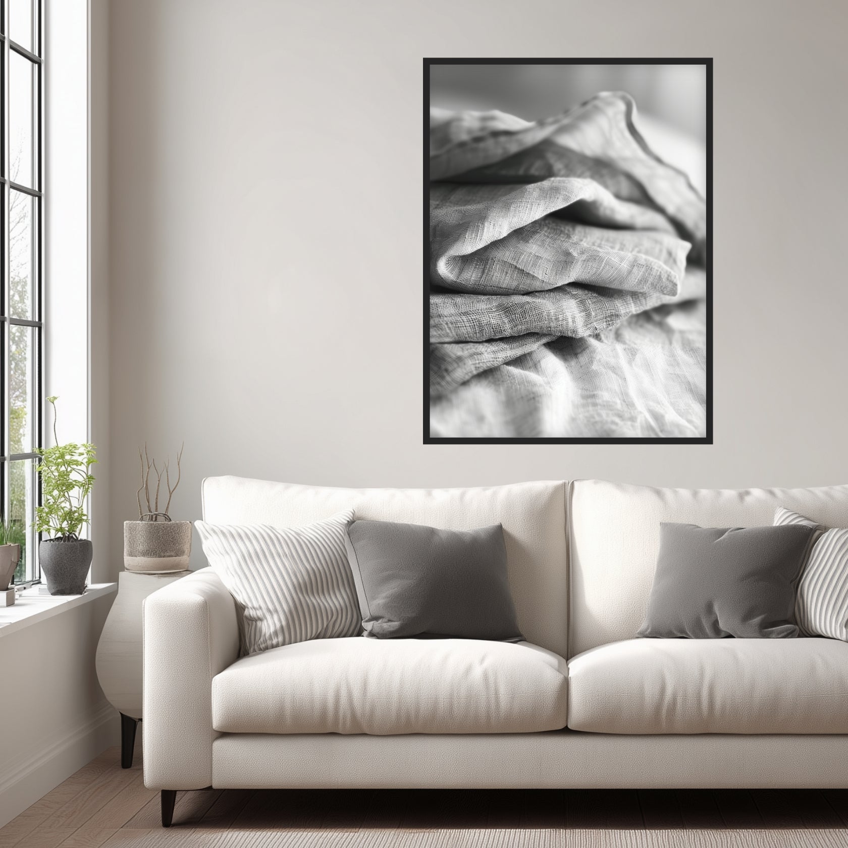 Dieses Schwarz-Weiß-Poster zeigt gefaltetes Leinen in einer ruhigen, reduzierten Komposition. Die Nahaufnahme macht feine Gewebestrukturen sichtbar, während Licht und Schatten sanft über die Stoffoberfläche gleiten. Die Bildwirkung ist klar, weich und zurückhaltend.