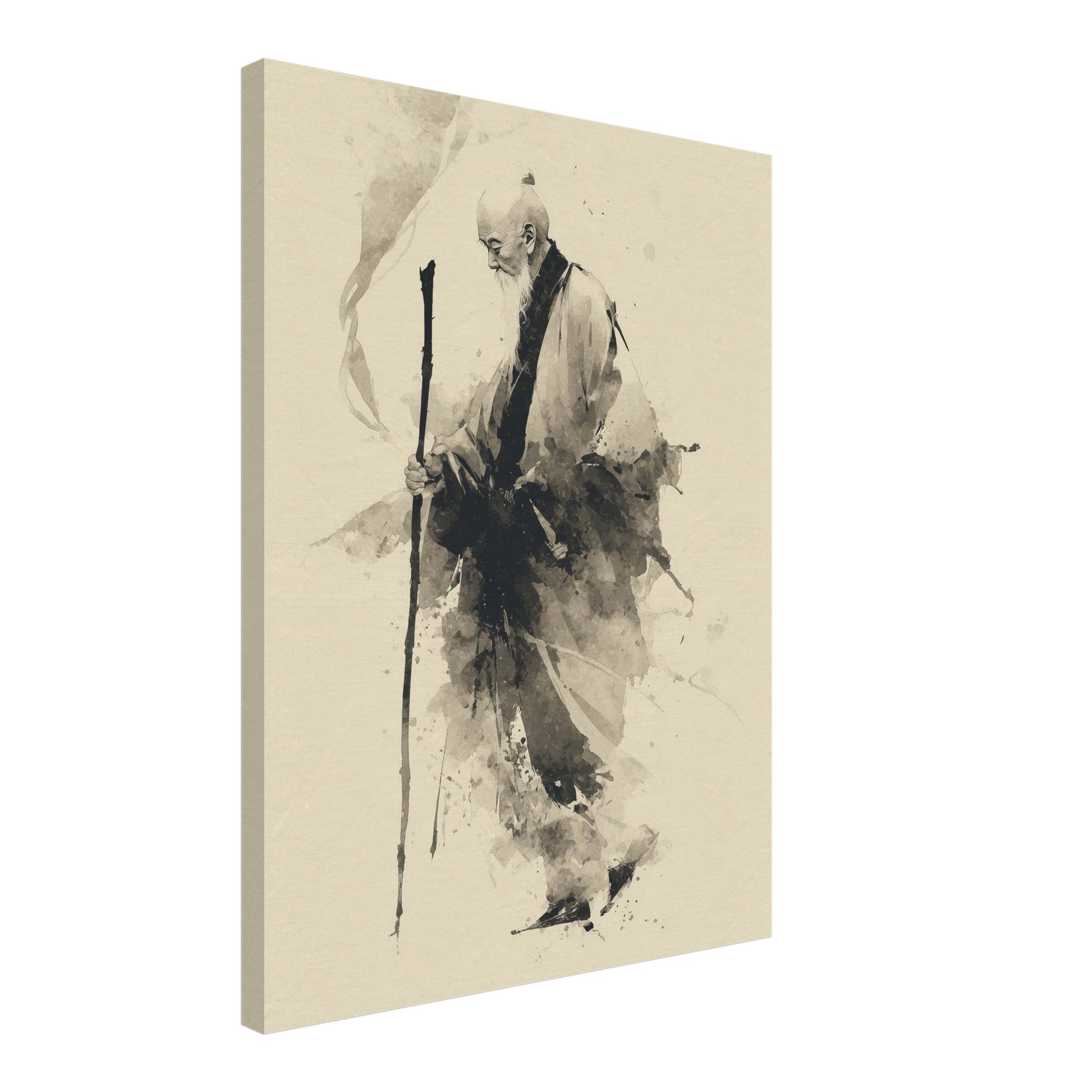 Die Szene entfaltet sich wie ein leiser Übergang. Der Mönch bewegt sich bedacht, sein Stab begleitet ihn wie ein stiller Partner. Die weichen Strukturen seines Gewands verschmelzen mit den zarten Schatten und lassen eine ruhige Tiefe entstehen. Die Darstellung öffnet einen Raum, der besonders im Wohnzimmer oder im Flur eine gelöste, achtsame Stimmung hervorruft. Die schlichte Komposition lädt zu langsamer Wahrnehmung ein. Durch Zen Design und Zen Bilder entsteht ein ruhiger Ausdruck, der dauerhaft klar und ausgewogen wirkt.