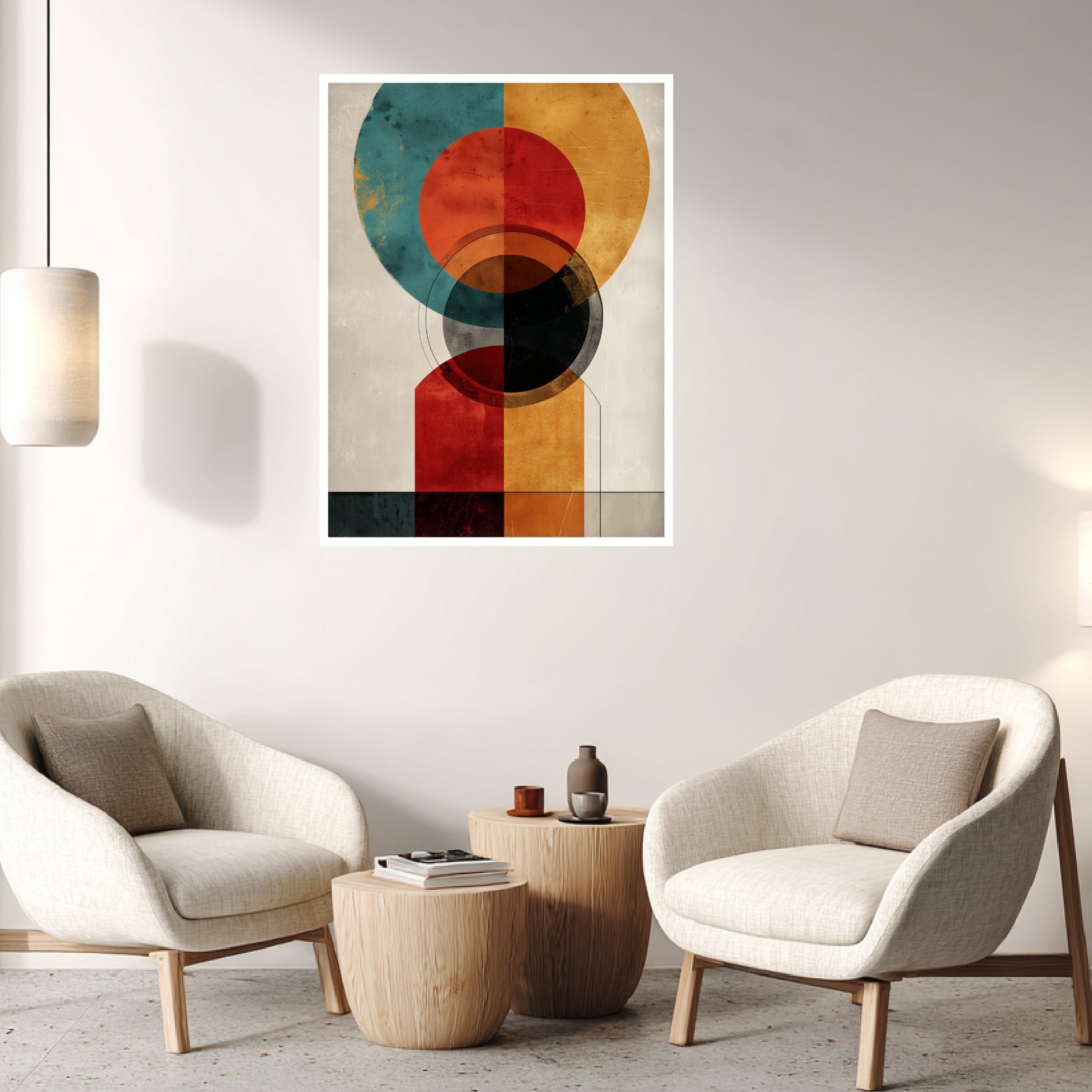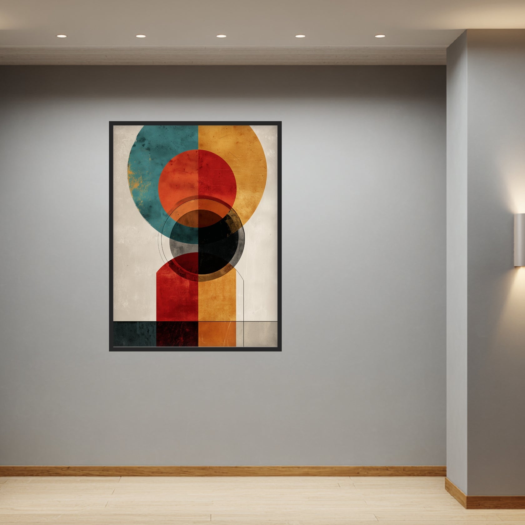 Das Poster zeigt eine präzise aufgebaute Komposition aus Kreisen und Rechteckflächen, die sich überlagern und gegenseitig ausbalancieren. Die Farbpalette aus Ocker, Rostrot, Petrol und Grau erzeugt eine ruhige Spannung, während feine Texturen dem Motiv eine subtile Lebendigkeit verleihen. Diese ausgewogene Gestaltung macht das Werk zu einem starken Element moderner Wandbilder Abstrakt Modern. Besonders im Wohnzimmer oder im Flur fügt sich das Poster harmonisch ein und unterstreicht den Charakter von Abstrakte Kunst Poster, die Klarheit und Ausdruck verbindet.