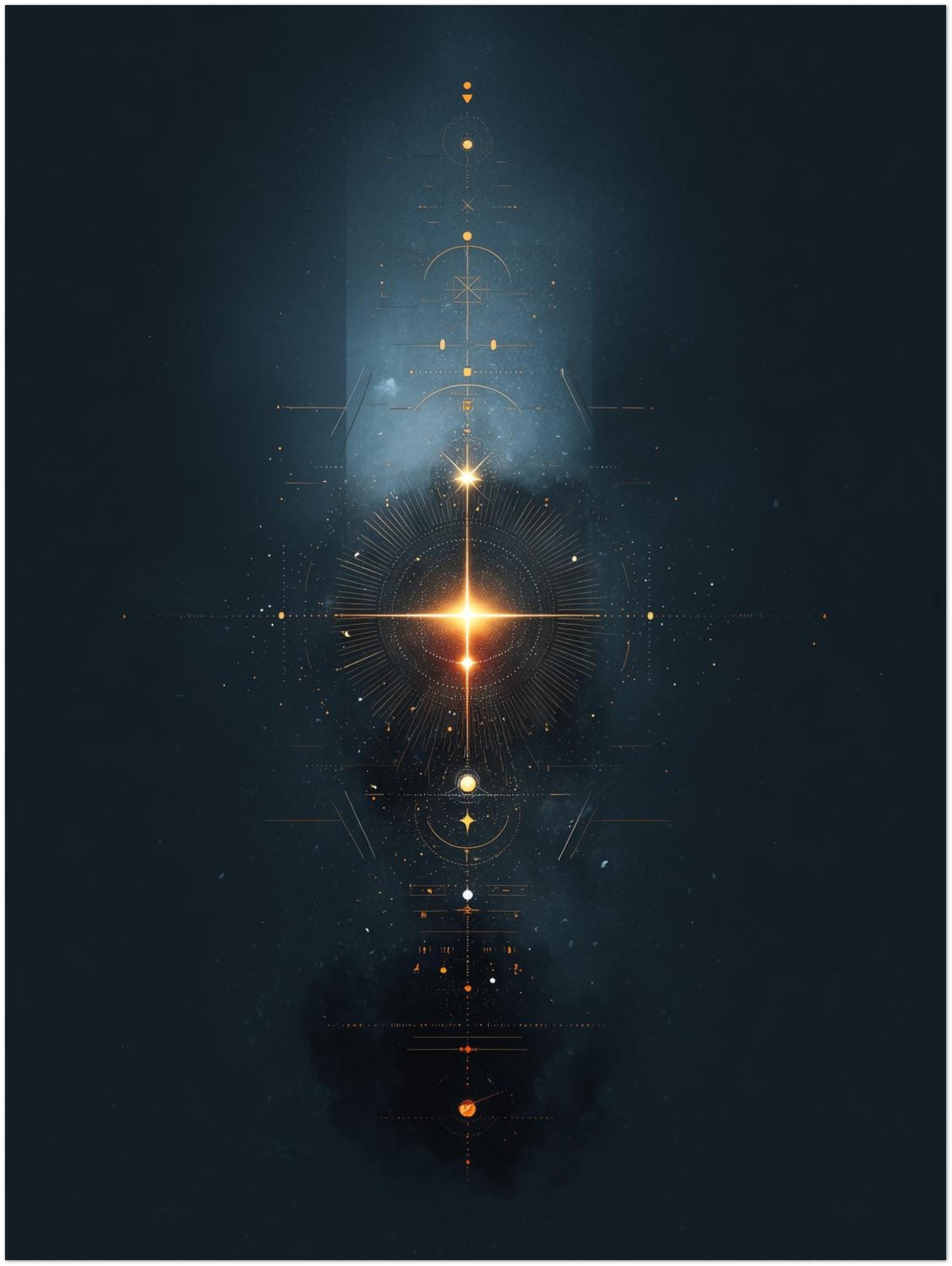 Im Zentrum des Motivs steht ein leuchtender Punkt, von dem aus sich feine Linien und geometrische Formen symmetrisch entfalten. Die dunkle, kosmische Tiefe des Hintergrunds verstärkt die Klarheit der Struktur und lenkt den Blick ruhig zur Mitte. Goldene Akzente setzen gezielte Lichtimpulse, ohne die Komposition zu dominieren. Das Zusammenspiel aus Ordnung und Weite erzeugt eine stille Spannung. Besonders im Wohnzimmer oder Flur unterstützt das Poster eine ausgleichende Atmosphäre. Als modernes Beispiel für Spirituelle Poster verbindet es präzise Gestaltung mit der ruhigen Wirkung der Poster Spiritualität.