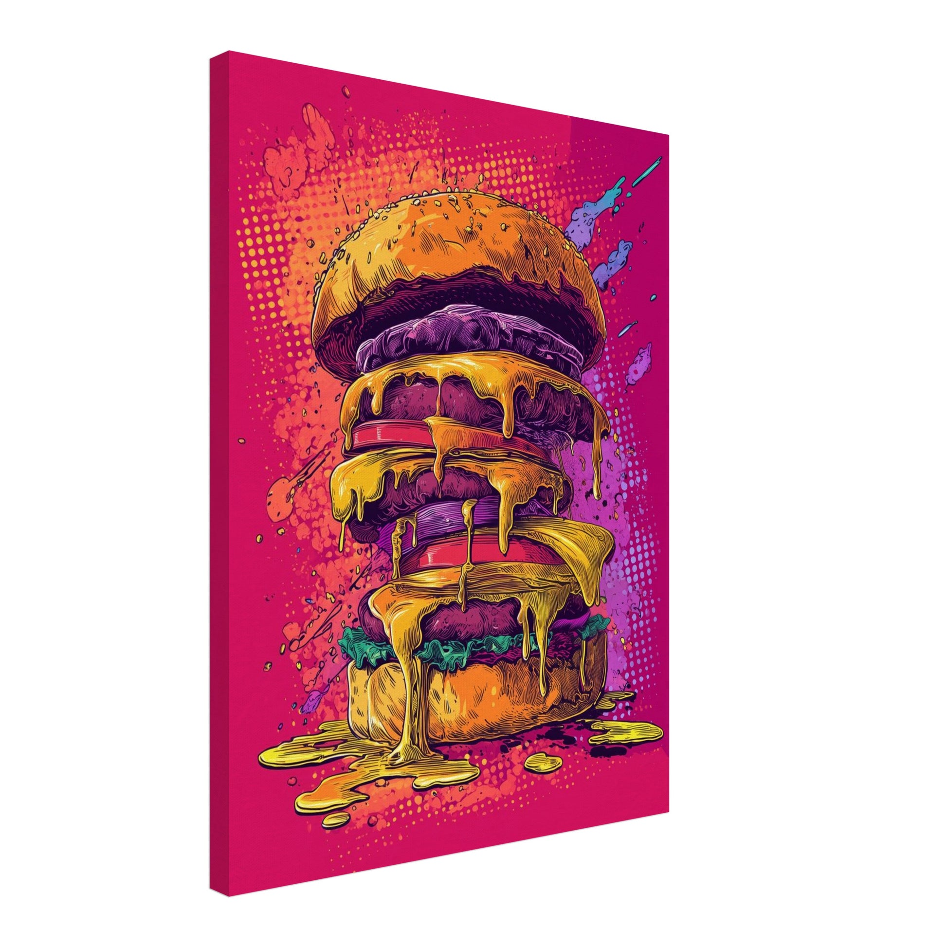 Kunst, die knallt: Auf Leinwand gewinnt der geschmolzene Riesenburger zusätzlich an Tiefe und Strahlkraft. Die tropfenden Käseschichten wirken fast plastisch, während die kräftigen Kontraste zwischen Gelb, Orange und Magenta ein lebendiges Pop-Art-Spektakel erschaffen. Linien, Spritzer und die strukturelle Intensität der Farben machen dieses Motiv zu einem urbanen Blickfang, ideal für Küche oder Esszimmer. Das Werk gehört zu den markantesten Pop Art Bilder, dynamischen Pop Art Bilder Leinwand und modernen Popart Kunstwerke und setzt ein selbstbewusstes, farbstarkes Statement in jedem Raum.