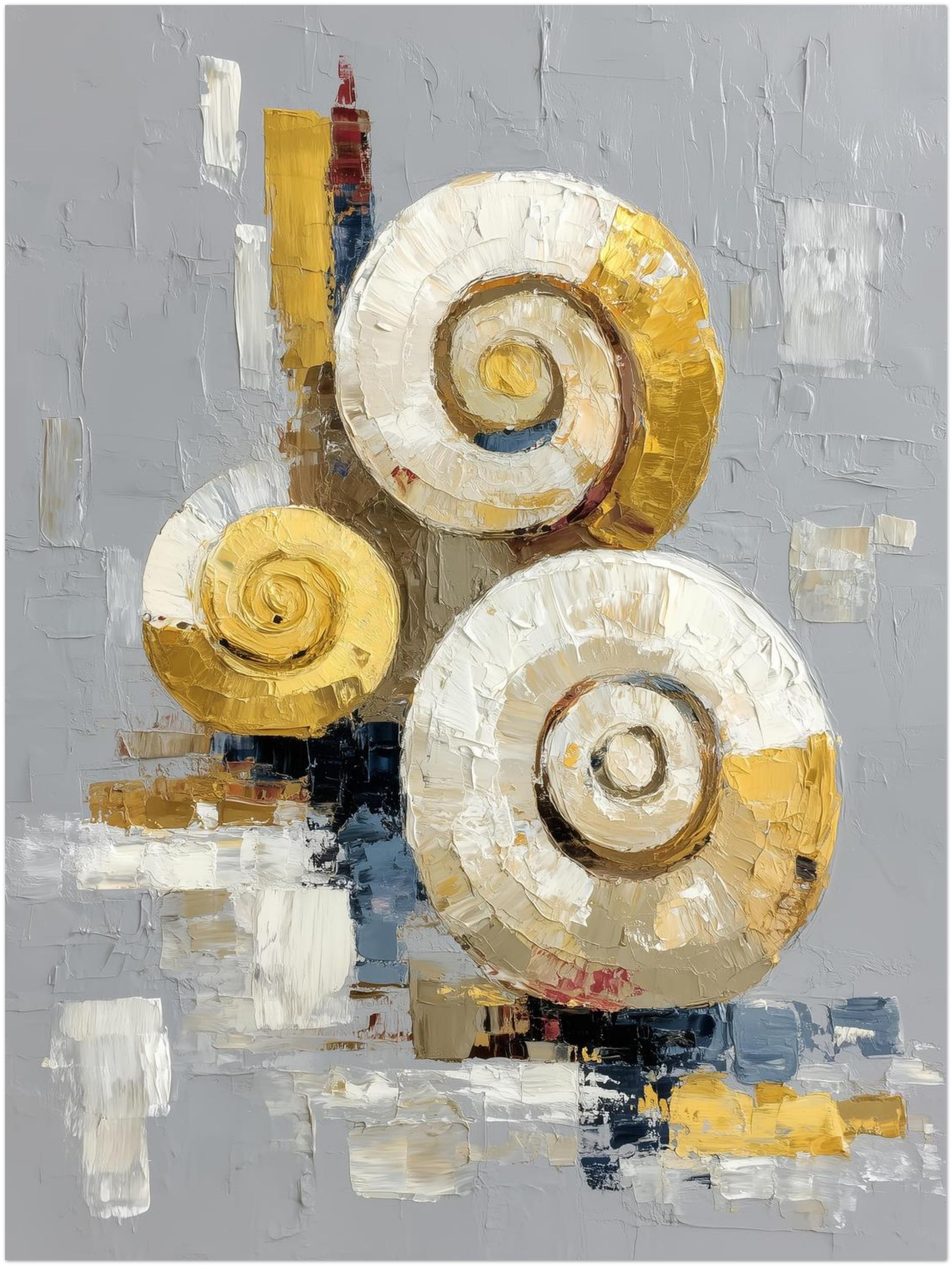 Dieses Poster zeigt eine ruhige, dennoch kraftvolle Komposition aus gold-weißen Spiralformen, deren pastose Farbschichten eine markante Struktur aufbauen. Die Spiralen wirken plastisch, fast reliefartig, während der graue Hintergrund mit seinen fein modellierten Flächen ein sanftes Gegengewicht bildet. Zwischen runden Formen und kantigen Fragmenten entsteht ein harmonisches Spannungsfeld, das Lichtreflexe und Materialtiefe klar hervorhebt. Die Komposition verbindet malerische Körperhaftigkeit mit einer zeitlosen grafischen Ordnung, wodurch sie die Ästhetik moderner Abstrakte Kunst Poster aufgreift und zugleich den reduzierten Charakter stilvoller Wandbilder Abstrakt Modern transportiert. Besonders im Wohnzimmer oder Flur entfaltet das Motiv eine strukturreiche, ruhige Präsenz.