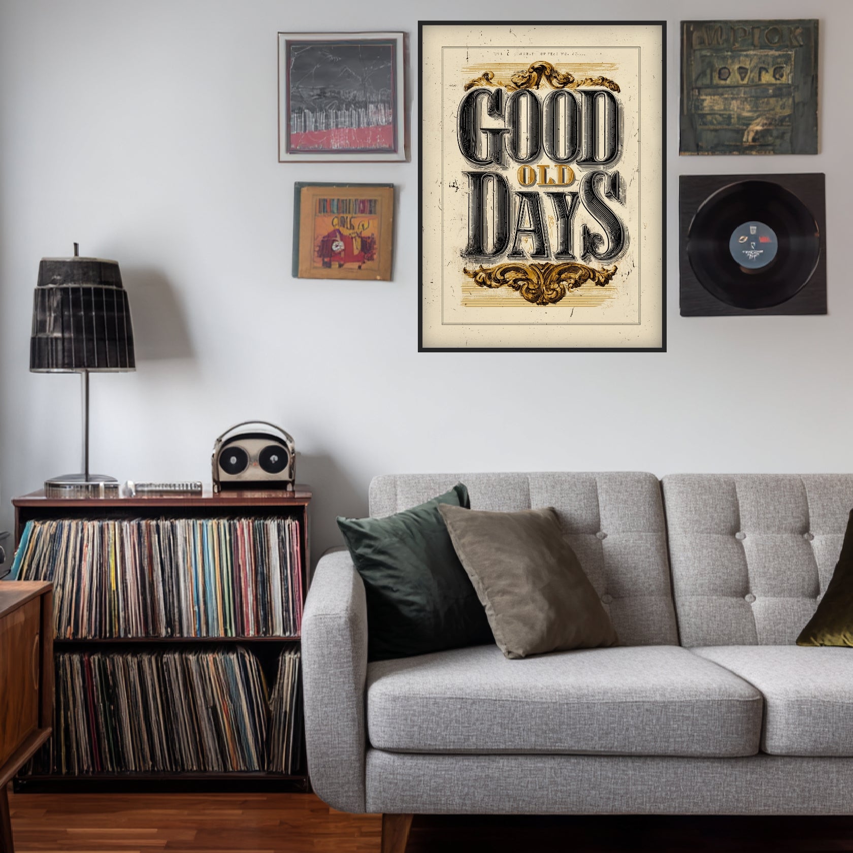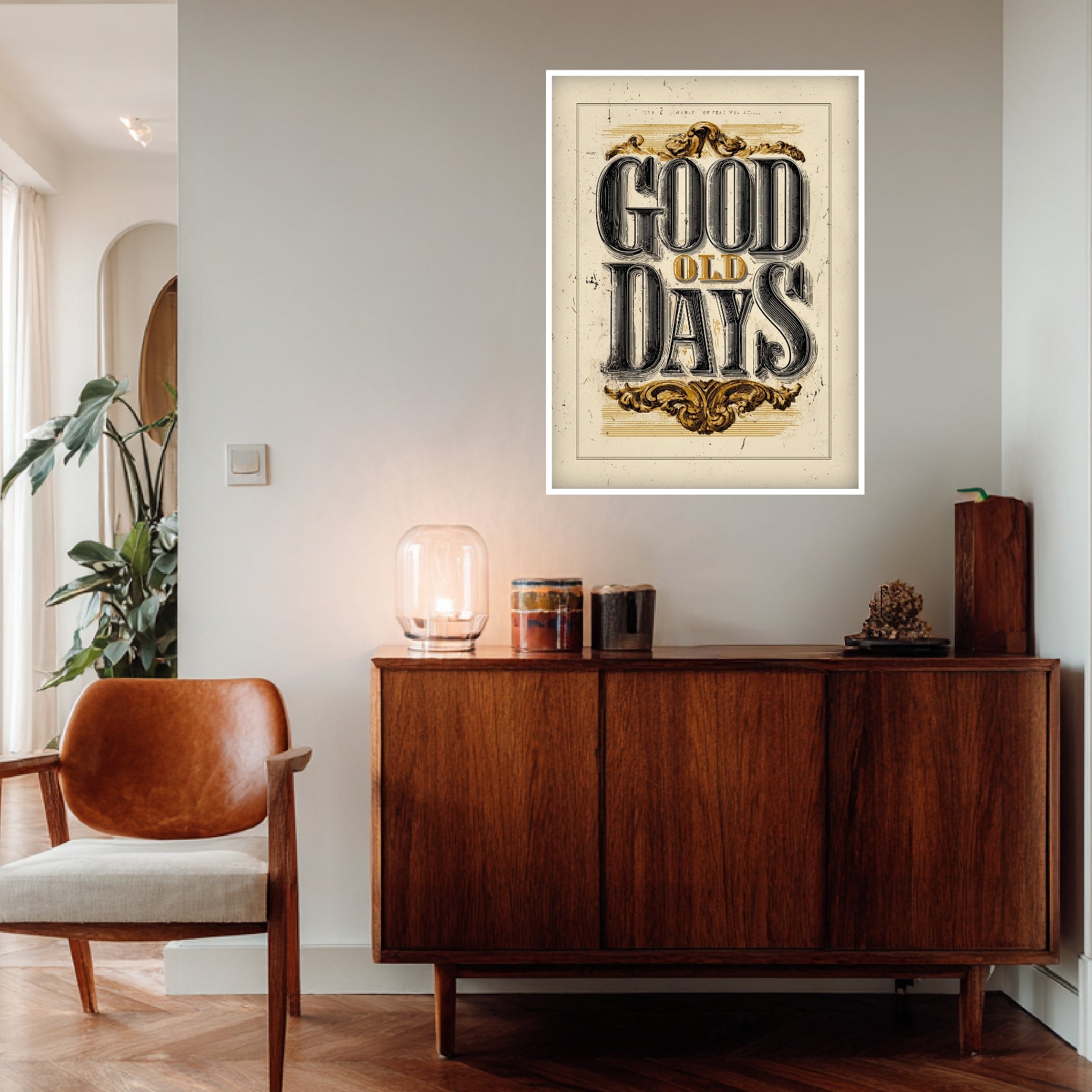 Das Poster „Good Old Days“ zeigt eine kunstvolle typografische Komposition im Stil traditioneller Buchdruckkunst. Die großen, tiefschwarz schraffierten Buchstaben besitzen eine plastische Wirkung, die durch feine Linien und dezente Schatten modelliert wird. Goldfarbene Ornamente umrahmen das Motiv, während leichte Gebrauchsspuren und eine sanft gealterte Oberfläche eine warme Patina entstehen lassen. Der Hintergrund in hellem Beige verleiht dem Werk eine ruhige, klassische Balance. In Wohnräumen, Fluren oder Büros entfaltet dieses Poster eine nostalgische, zugleich elegante Wirkung und bereichert die Atmosphäre mit dem unverwechselbaren Charme eines Original Vintage Poster.