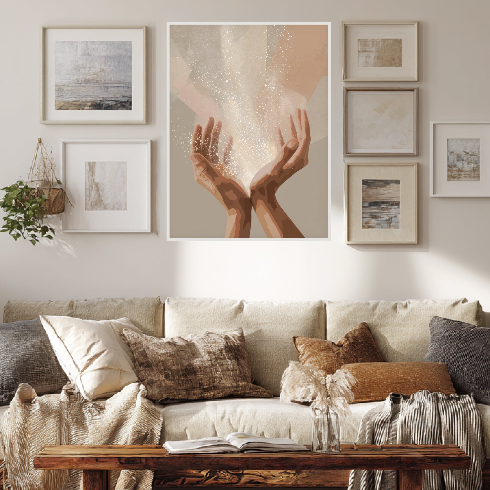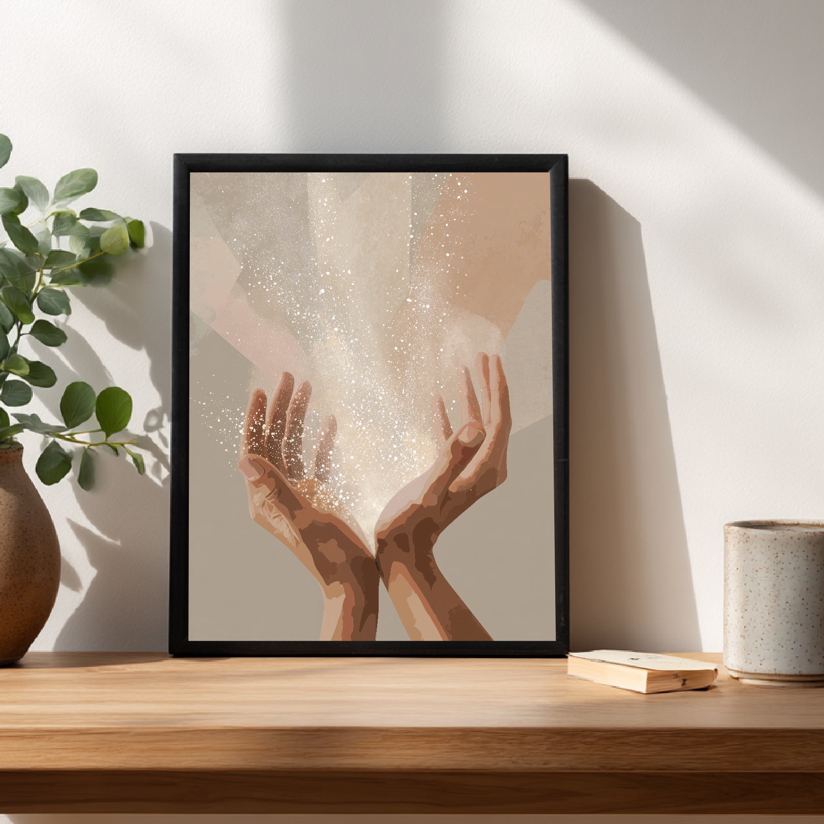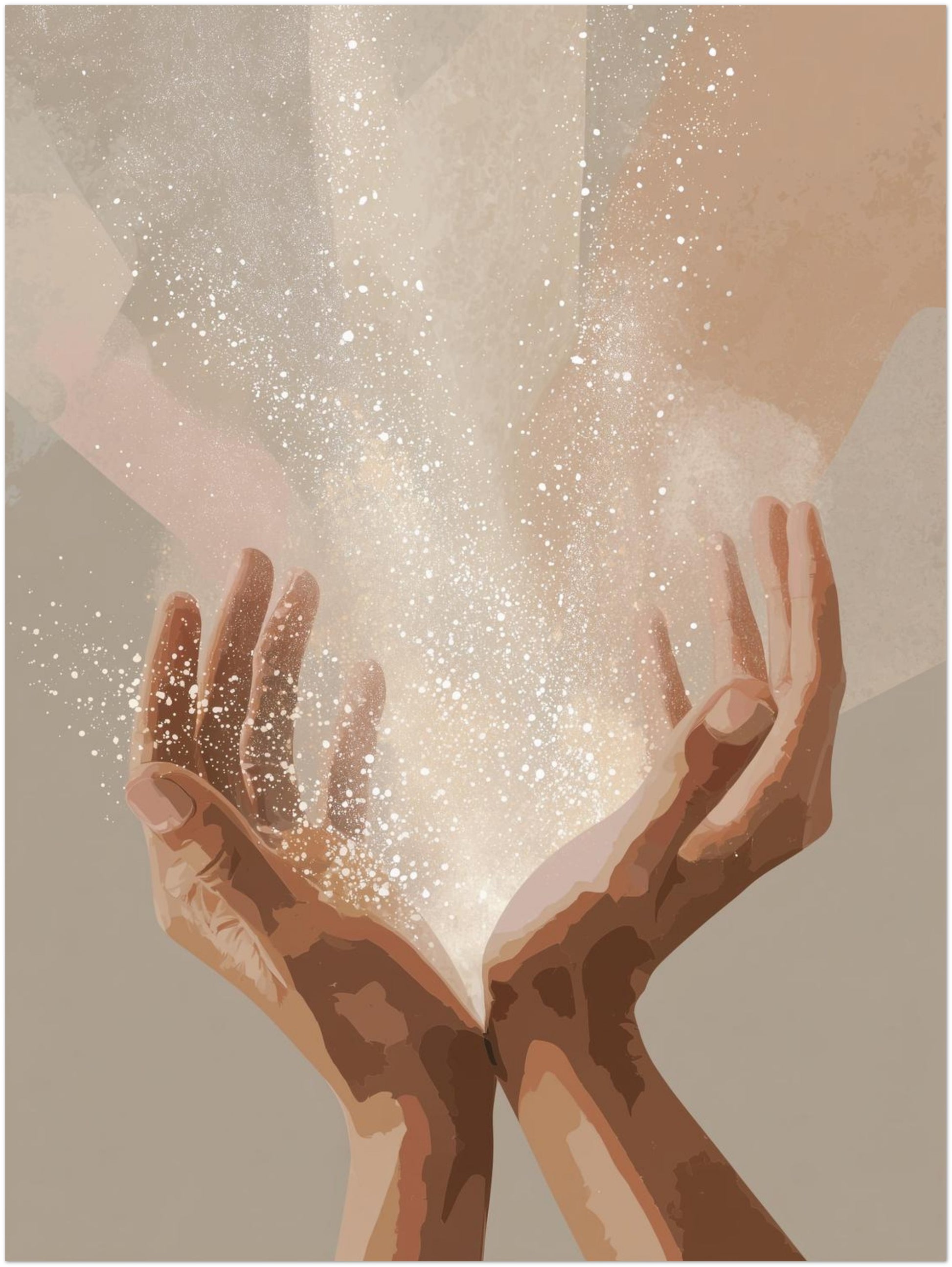 Aus geöffneten Händen steigt eine feine, lichtartige Struktur auf, die sich sanft im Bildraum verteilt. Die Partikel wirken leicht und schwebend und erzeugen eine ruhige Bewegung, die den Blick nach oben führt. Die Farbflächen bleiben zurückhaltend und unterstützen die Klarheit der Komposition. Linien und Licht stehen in einem ausgewogenen Verhältnis und schaffen eine stille Spannung. Besonders im Wohnzimmer oder Flur entfaltet das Motiv seine ausgleichende Wirkung. Als Ausdruck moderner Poster Spiritualität ergänzt es hochwertige Spirituelle Poster mit einer ruhigen, zentrierenden Präsenz.