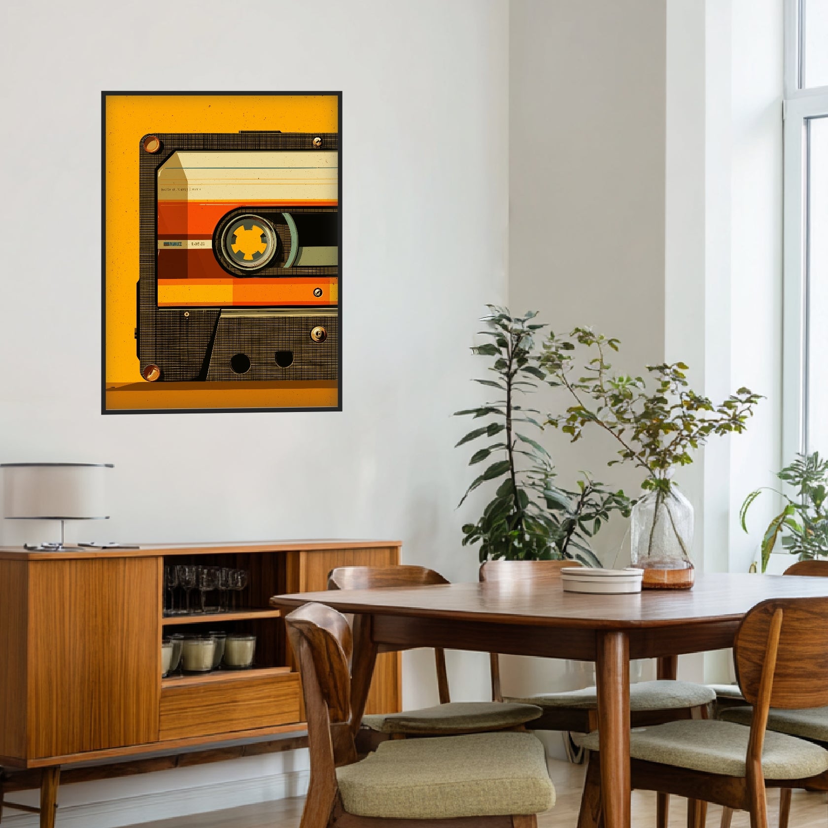 Das Poster zeigt die Hälfte einer Audiokassette, deren grafische Struktur durch feine Rasterlinien und sanfte Körnung geprägt ist. Die warmen Farbbereiche in Gelb, Beige und Orange schaffen eine ruhige, analoge Atmosphäre, während Schrauben, Spulenrad und Konturen präzise ausgearbeitet sind. Der großzügige Hintergrund verstärkt die geordnete, klar definierte Wirkung des Motivs. Die Komposition öffnet Räume und setzt einen warmen grafischen Akzent, der besonders in Wohnzimmern, Büros oder Fluren zur Geltung kommt. Mit seiner reduzierten, retroinspirierten Darstellung verbindet das Bild technische Nostalgie mit moderner Klarheit – ein harmonischer Ausdruck von Retro Stil und einem fein strukturierten Kunstdruck Retro.