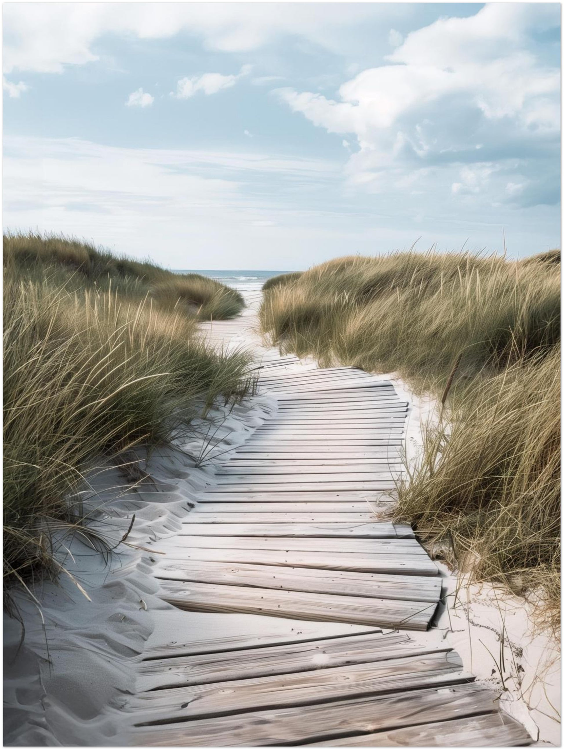 Auf Leinwand gewinnt der Weg durch die Dünen an Tiefe und Natürlichkeit. Die sichtbare Struktur verstärkt die Wirkung der Natur Landschaft und lässt die Gräser lebendig erscheinen. Der Holzsteg führt den Blick sanft nach vorne und verleiht dem Landschaft Leinwandbild eine ruhige Dynamik. Farben und Linien bleiben weich, fast fließend.