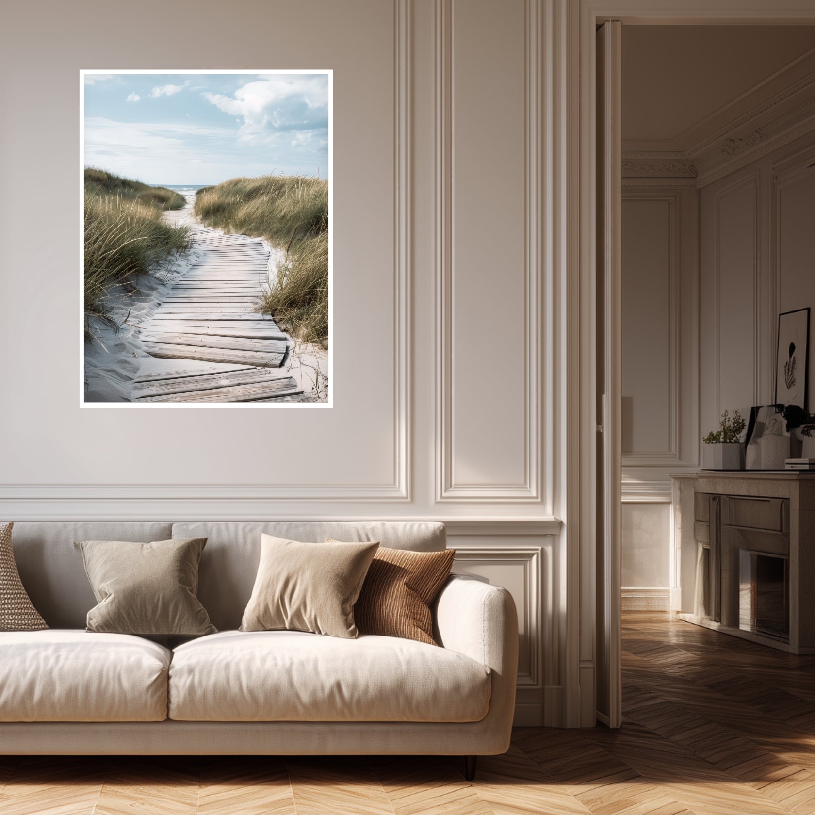 Der Holzsteg zieht sich als klare Linie durch die Dünen und gibt dem Landschaft Poster eine ruhige, fast meditative Struktur. Links und rechts rahmen feine Gräser den Weg, während sich im Hintergrund der Horizont öffnet. Das Licht ist weich und gleichmäßig, wodurch Sand- und Beigetöne besonders sanft wirken. Diese Landschaft lebt von Zurückhaltung und Weite, ohne dominant zu sein.