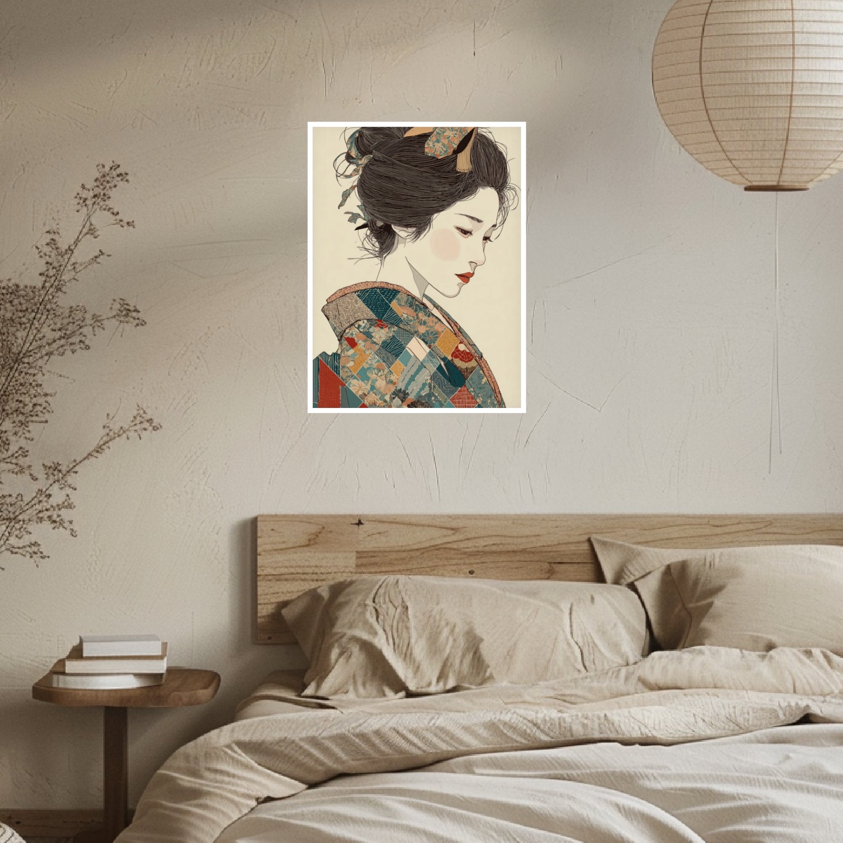 Das Japanische Frau im Kimono Poster fängt die stille Schönheit eines Augenblicks ein. Die fein gezeichneten Linien, die weichen Farbtöne und das kunstvolle Muster des Kimonos schaffen eine Komposition voller Harmonie und Tiefe. Der sanfte Blick der Frau strahlt Ruhe aus – eine Ästhetik, die die Werte des Japandi Style widerspiegelt: Natürlichkeit, Balance und Achtsamkeit. Dieses Japandi Poster wirkt besonders im Schlafzimmer oder Wohnzimmer, wo es mit seiner leisen Präsenz einen Ort der inneren Ruhe entstehen lässt. Ein Kunstwerk, das die Verbindung zwischen Tradition und moderner Schlichtheit im Japandi Design vereint.
