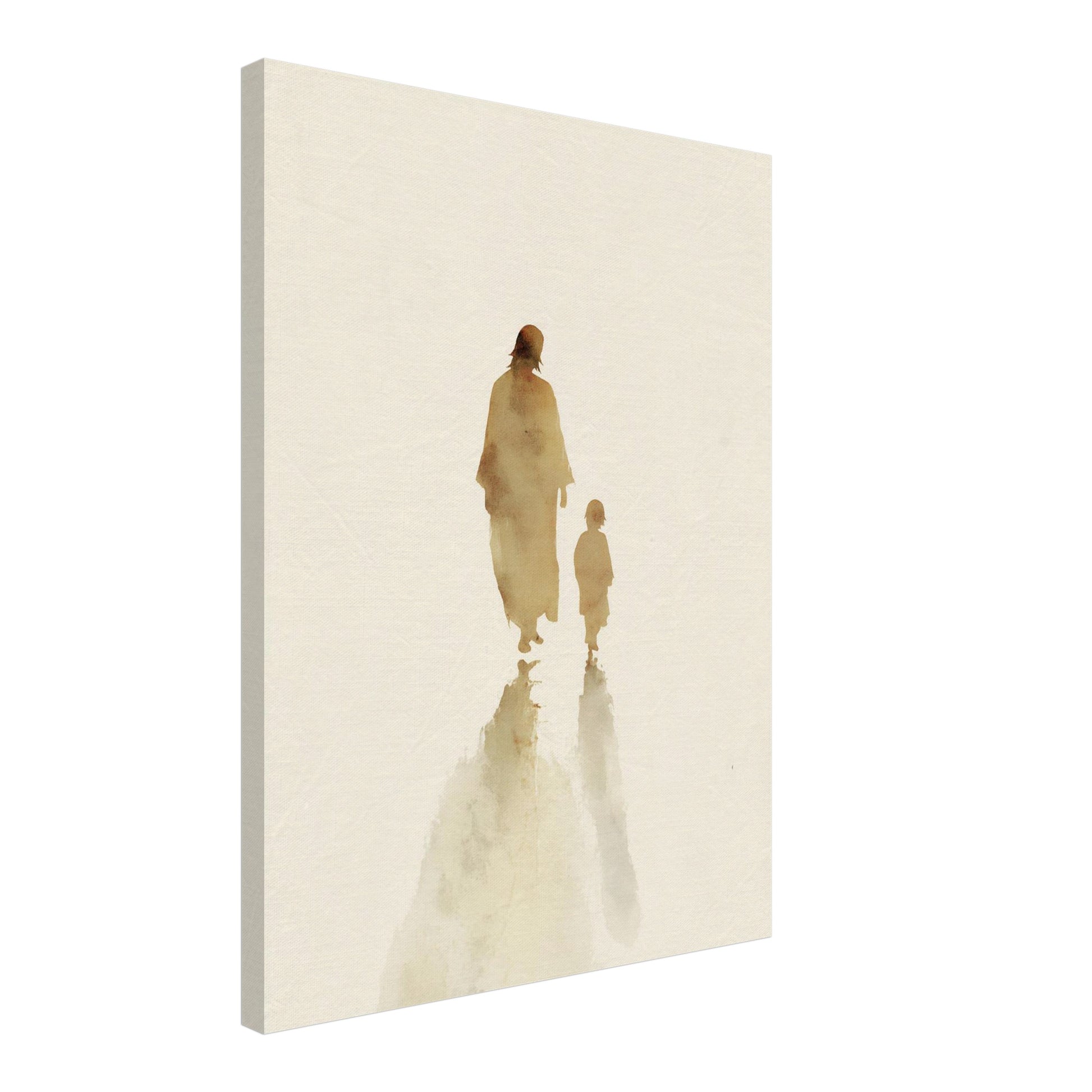Als Leinwandbild wirkt das Motiv noch organischer: Die feinen Aquarellstrukturen scheinen sich wie transparente Schichten übereinanderzulegen und schenken der Szene eine zarte Körperlichkeit. Jesus und das Kind erscheinen als warme Silhouetten, die durch weiche Lichtakzente betont werden. Die sanft verlaufenden Schatten verleihen dem Bild räumliche Tiefe und erzeugen eine Atmosphäre stiller Verbundenheit. Besonders im Schlafzimmer oder Wohnzimmer kommt die beruhigende Wirkung zur Geltung, da das Werk eine leise, tröstende Wärme ausstrahlt. In dieser zeitlosen Darstellung findet die Essenz von Christliche Bilder ihren sanften Ausdruck.