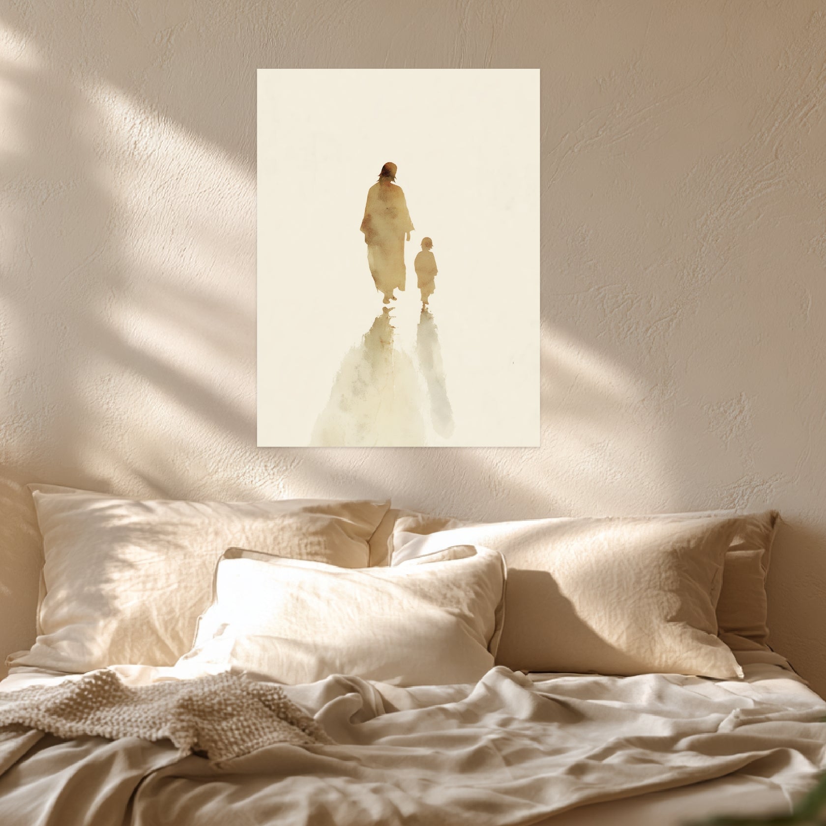 Dieses Poster zeigt eine besonders stille Szene, in der Jesus und ein Kind in weichen Aquarellformen erscheinen. Die Figuren lösen sich fast aus dem hellen Hintergrund, wodurch ein Gefühl von Licht und Leichtigkeit entsteht. Die sanften Farbverläufe bilden natürliche Übergänge, die wie ein fließender Schleier über dem Motiv liegen. Die Schatten, die sich unter den Figuren ausbreiten, verleihen der Komposition Tiefe und führen den Blick in eine ruhige, kontemplative Richtung. Im Wohnzimmer oder Flur entfaltet dieses Werk eine sanfte, spirituelle Präsenz und trägt die stille Botschaft von Christliche Poster in moderner, klarer Bildsprache.