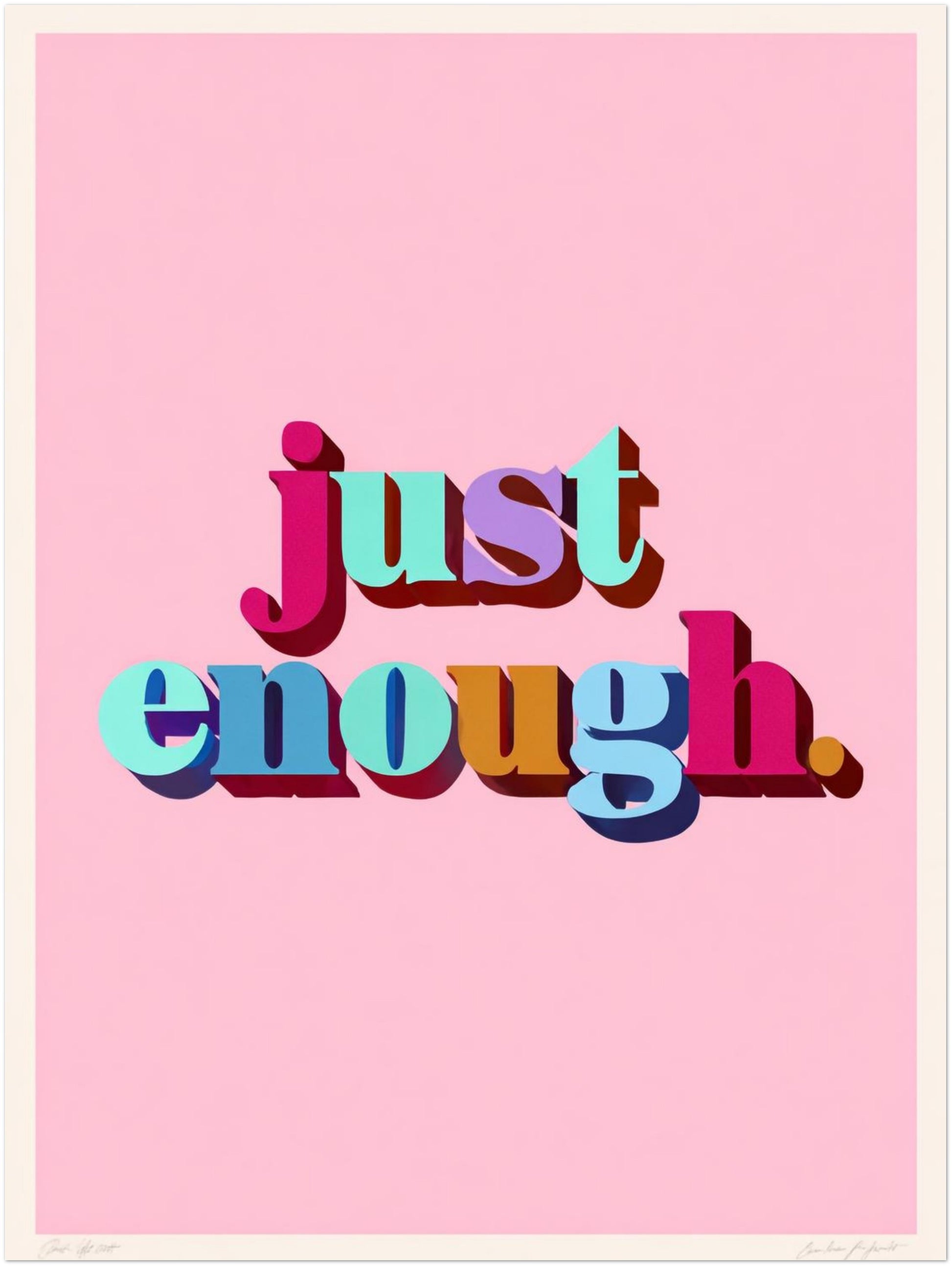 Ein sanfter Rosaton bildet die Grundlage für den kraftvoll inszenierten „Just Enough“-Schriftzug, dessen farbige Buchstaben eine lebendige Tiefe erzeugen. Der verspielte Schattenwurf verleiht dem Motiv eine moderne Dreidimensionalität, die besonders in Küche oder Flur eine belebende Wirkung entfaltet. Die Komposition spiegelt die Optimismus-Ästhetik des Dopamine Decor wider und fügt sich hervorragend in die fröhliche Welt der Dopamine Deko ein. Dieses Dopamine Decor Poster wirkt wie eine liebevolle Erinnerung daran, dass Ausgewogenheit Kraft schenkt. Im Dopamine Style verbindet es Mut zur Farbe mit einer klaren Botschaft und wird zu inspirierender Dopamine Art, die jeden Raum bereichert.