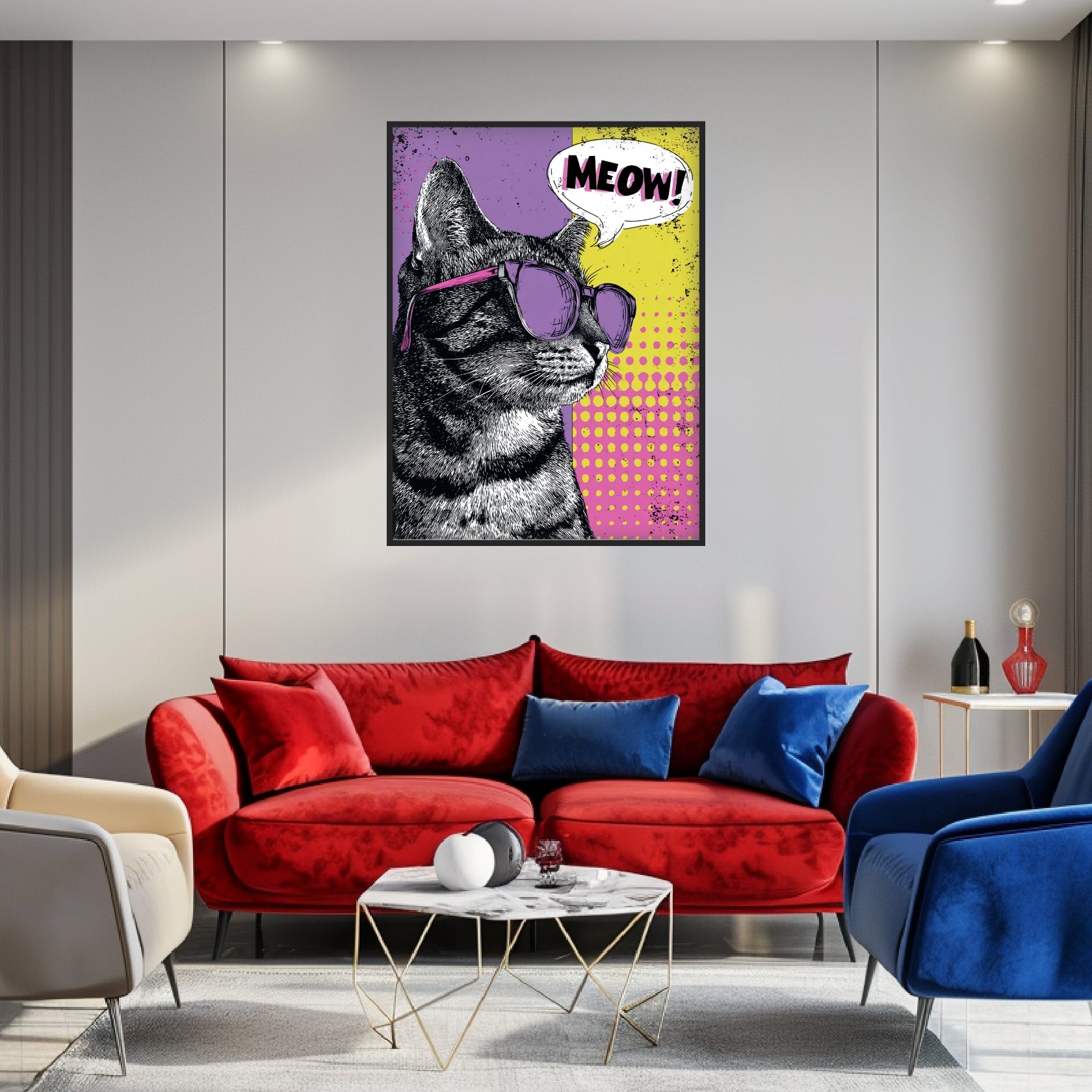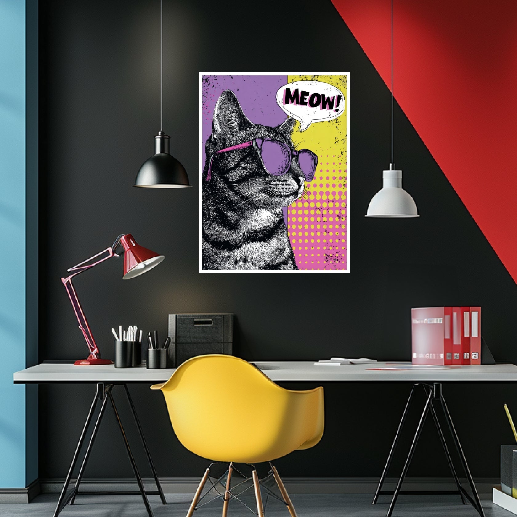 Ein Bild, das laut spricht – das Pop Art Poster „Katze mit Sonnenbrille“ kombiniert grafische Schärfe mit spielerischem Humor. Schwarze Linien und klare Schattierungen verleihen der Katze Tiefe und Präsenz, während kräftiges Violett, Pink und Gelb den Hintergrund in vibrierende Energie tauchen. Das comicartige „MEOW!“ setzt ein freches Statement, das urbane Coolness verkörpert. Dieses Popular Art-Highlight ist ideal für Wohnzimmer oder Büro und bringt mit seinem Pop Art Motiv den Popart Stil auf charmante und rebellische Weise zur Geltung.