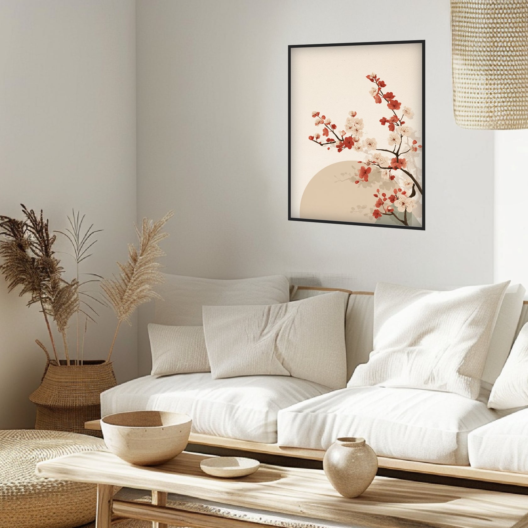 Das Kirschblütenzweig mit Sonne Poster fängt den Moment des Erwachens ein – ein zarter Zweig, der sich vor einer weichen, warmen Sonne öffnet. Die Blüten in feinen Rot- und Cremetönen entfalten sich mit Leichtigkeit, während Licht und Schatten still miteinander verschmelzen. Dieses Bild verkörpert die ruhige Schönheit des Japandi Style und spiegelt die tiefe Ästhetik der Japanische Kunst wider. Ideal für Schlafzimmer oder Wohnzimmer bringt es eine Atmosphäre stiller Freude und natürlicher Harmonie, die die Essenz von Japandi Design spürbar macht.