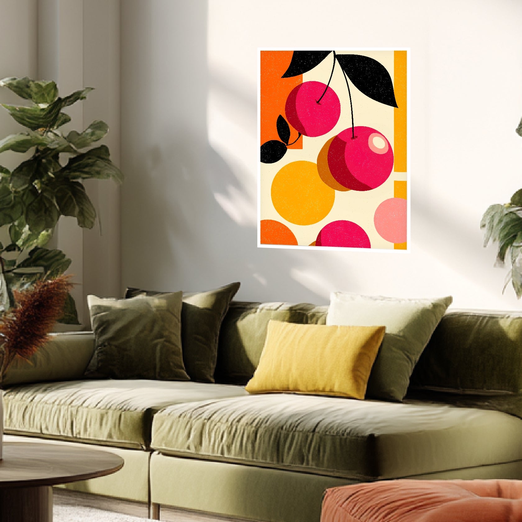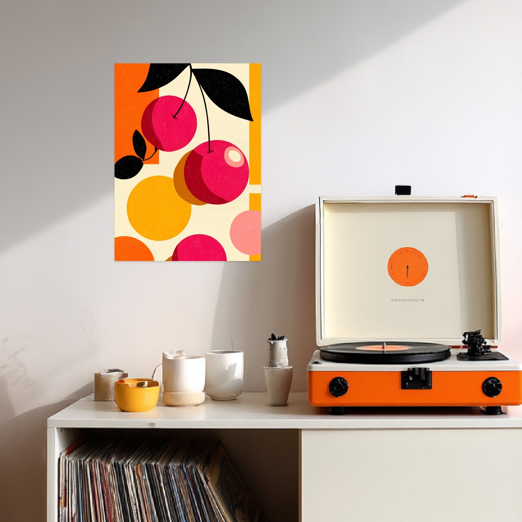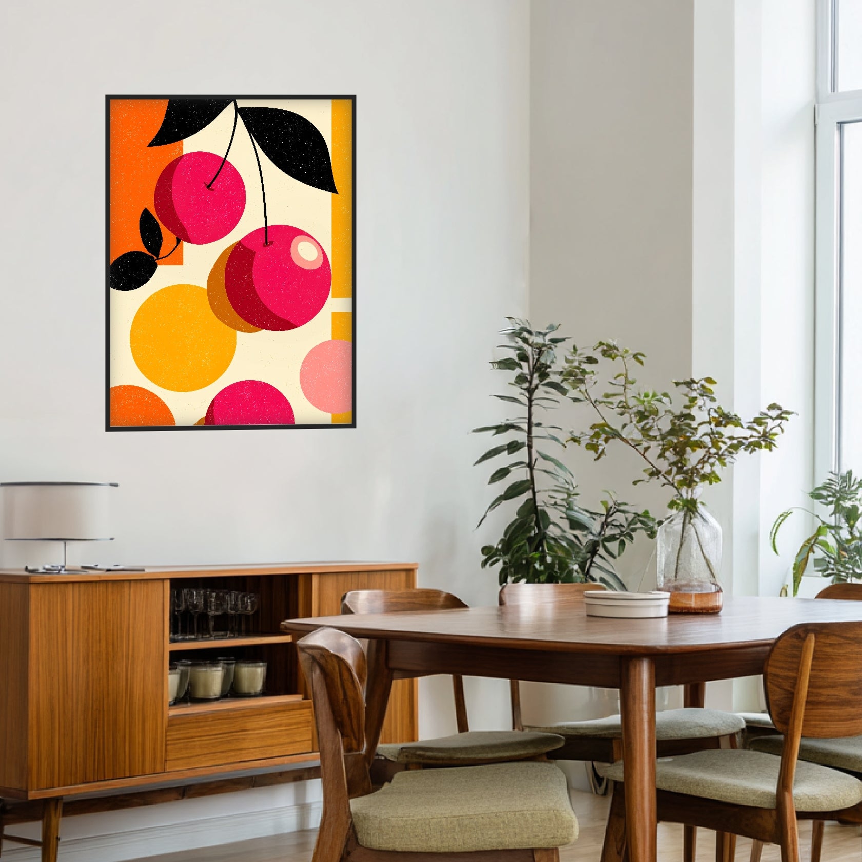 Das Poster zeigt stilisierte Kirschen, umgesetzt in runden Farbflächen und klaren Konturen. Die Komposition wirkt ausgewogen und ruhig, getragen von warmen Rot-, Orange- und Beigetönen. Schwarze Blattformen setzen grafische Akzente und geben dem Motiv Struktur. Feine Körnung und dezente Unregelmäßigkeiten verleihen dem Retro Design eine authentische, analoge Tiefe. Als Retro Poster eignet sich das Motiv besonders für Küchen, Esszimmer oder Wohnräume mit klarer, zeitloser Gestaltung.