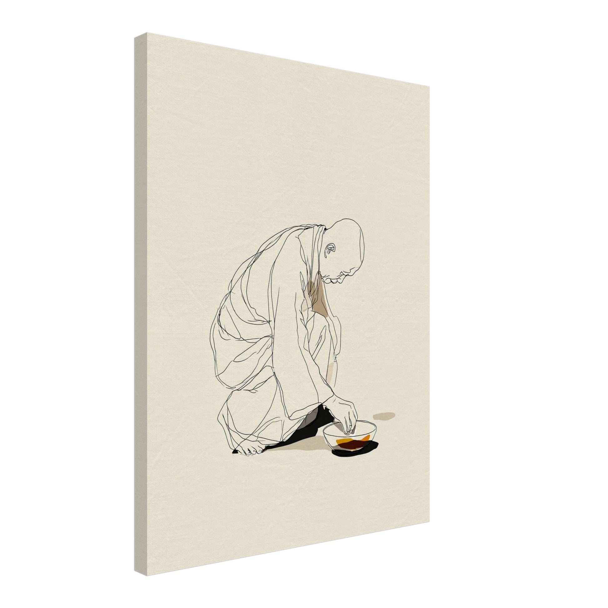 Auf Leinwand entfaltet das Motiv eine warme, fast atmende Präsenz. Die Figur des Mönchs erscheint behutsam modelliert, als würde sie in den weichen Stoffschichten und der gebeugten Haltung einen Moment innerer Ruhe bewahren. Die natürliche Farbgebung und die sanften Schatten verleihen dem Werk eine ruhige Tiefe, die den Grundgedanken des Japandi Stil trägt. Im Schlafzimmer entsteht eine stille, erdende Atmosphäre, in der die Schüssel zu einem Symbol für Konzentration und Einfachheit wird. Das Motiv fügt sich harmonisch in ein bewusst gestaltetes Japandi Interior ein und verbindet leichte Abstraktion mit stiller Geste. Dadurch entsteht ein Leinwandbild, das die Klarheit von Form, Raum und Licht miteinander vereint und den Charakter von Japandi Wandbildern auf natürliche Weise widerspiegelt.