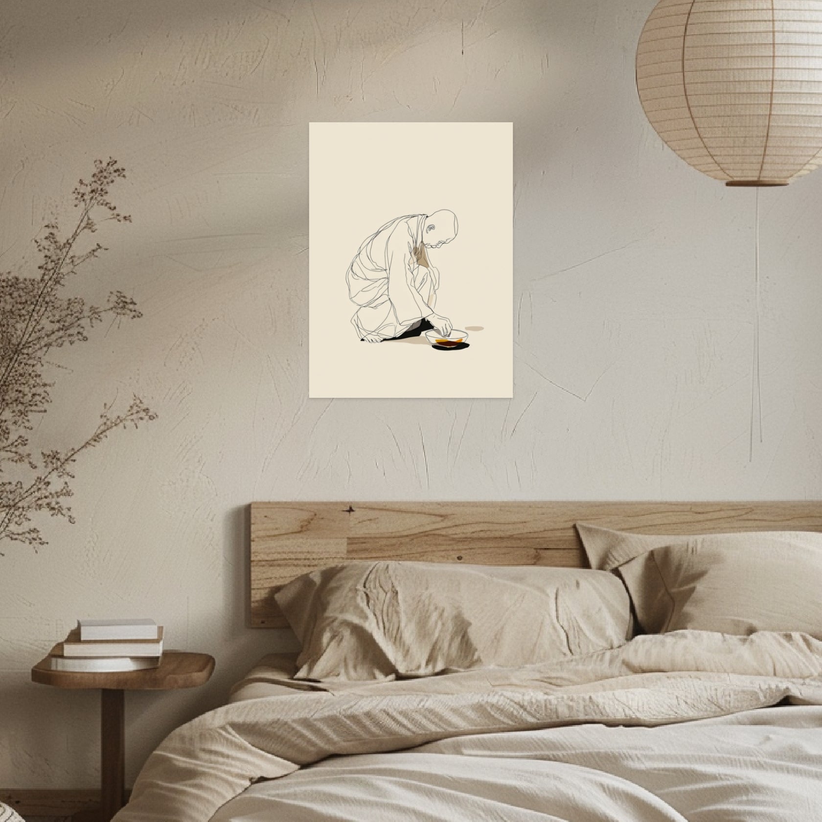 Die Wirkung dieses Posters entfaltet sich durch die leichtfüßige Linienführung, die den knienden Mönch in einem Moment stiller Konzentration zeigt. Das helle Umfeld und die zarten Konturen erzeugen eine Atmosphäre, die an die meditative Klarheit des Japandi Style erinnert. Die Schüssel vor ihm bildet einen ruhigen Ankerpunkt, der das Motiv erdet und in eine ausgewogene Balance bringt. Im Wohnzimmer entsteht so ein zarter Ausdruck von Achtsamkeit und Leere, der den Geist beruhigt und dem Raum Tiefe verleiht. Das Zusammenspiel aus Reduktion, zurückhaltendem Licht und einem Hauch Japanische Kunst führt zu einer zeitlosen Harmonie, die dem Japandi Design entspricht und das Motiv zu einem stillen Begleiter des Alltags macht.