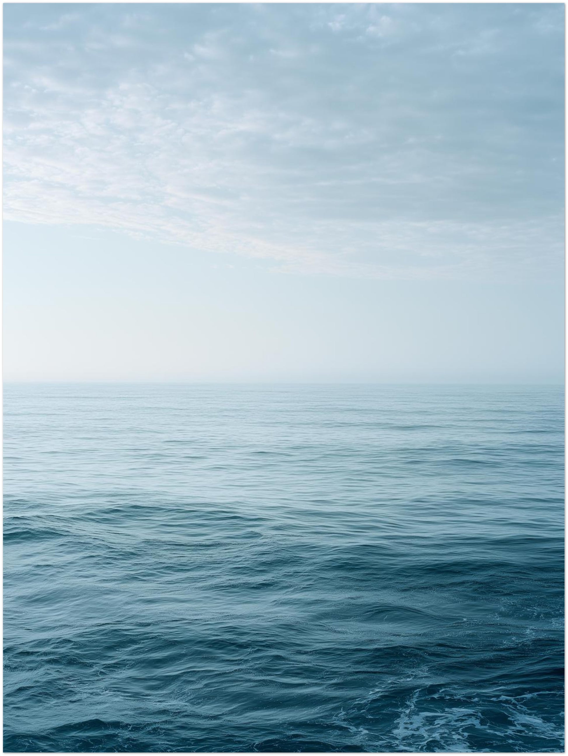 Dieses Landschaft Poster zeigt eine ruhige Meeresfläche, überzogen von feinen Wellen, die sich gleichmäßig bis zum Horizont bewegen. Der Himmel geht fast unmerklich in das Wasser über und erzeugt eine offene, klare Raumwirkung. Die zurückhaltende Farbpalette aus kühlen Blau- und Grautönen unterstreicht die stille Atmosphäre und lässt das Motiv leicht und ausgewogen wirken.