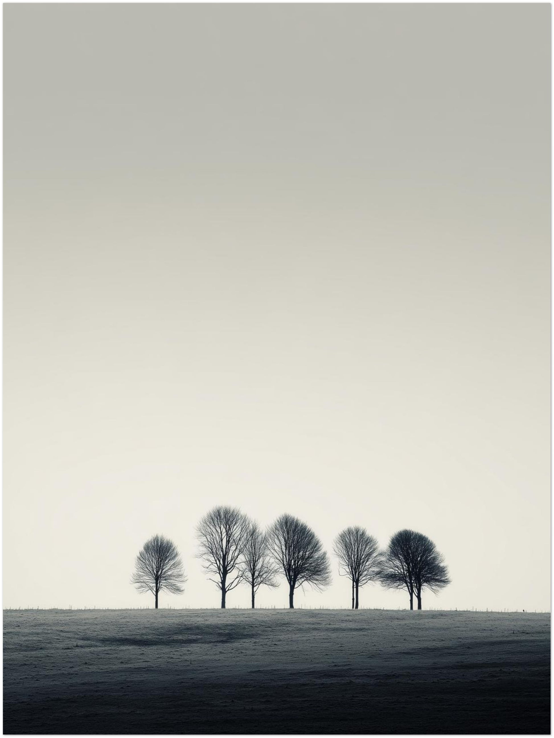 Die auf der Kuppe stehenden Bäume wirken ruhig und eigenständig, während der weite Himmel dem Motiv Raum zum Atmen gibt. Auf Leinwand gewinnen die feinen Verzweigungen und Kontraste an Tiefe und Präsenz. Die reduzierte Farbpalette lenkt den Blick auf Form und Komposition. Im Schlafzimmer entfaltet das Bild eine beruhigende, klare Wirkung. Auch im Badezimmer fügt sich das Motiv harmonisch ein und bringt stille Natur in den Raum. Die Leinwand verleiht der Landschaft eine dauerhafte, ruhige Präsenz mit zeitloser Ausstrahlung.