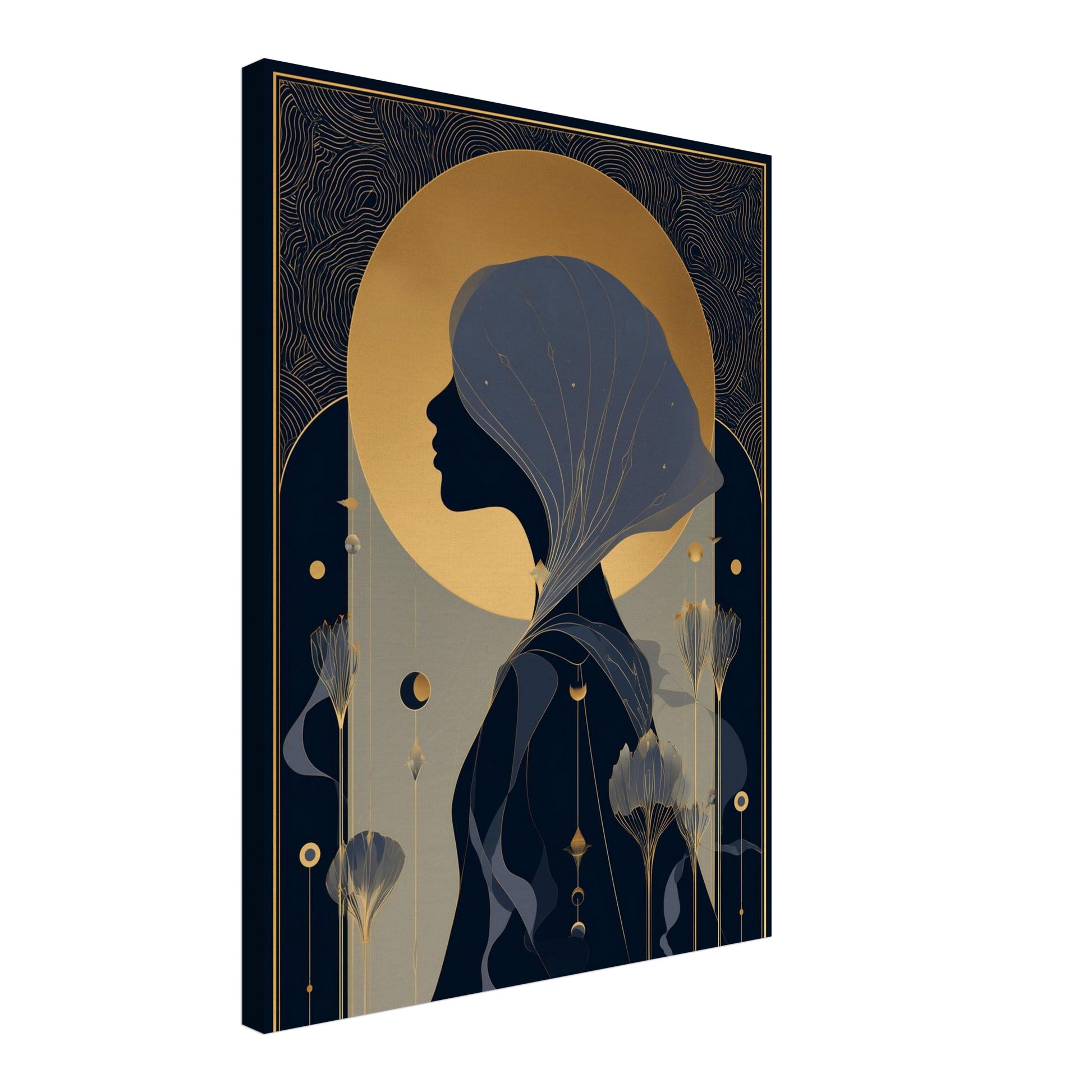 Die Darstellung entwickelt ihre Wirkung aus dem Zusammenspiel klarer FlĂ€chen und fein gesetzter Linien, die sich organisch ĂŒber das Motiv legen. Das Profil des MĂ€dchens erscheint ruhig und zentriert, wĂ€hrend goldene Akzente dem Bild eine sanfte Tiefe verleihen. Die Raumwirkung ist offen und ausgleichend, ohne dominant zu sein. Die Leinwandstruktur verstĂ€rkt die visuelle Ruhe und unterstĂŒtzt eine bewusste Wahrnehmung. Im Schlafzimmer oder Badezimmer fĂŒgt sich das Motiv harmonisch ein. Als Teil moderner Esoterik Bilder ergĂ€nzt es hochwertige Spirituelle Leinwandbilder mit stiller PrĂ€senz.